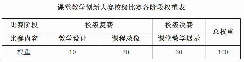 (一)比赛计分。校级比赛分两个阶段进行,参赛教师总得分为各阶段得分加权累计,各阶段分值权重如下。