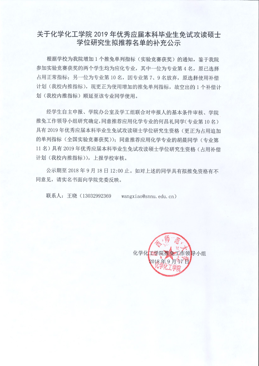 关于香蕉视频 2019年优秀应届本科毕业生免试攻读硕士学位研究生拟推荐名单的补充公示
