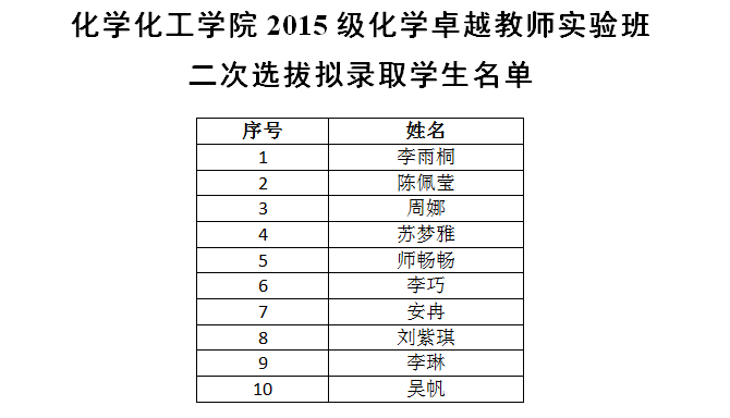 按照《香蕉视频 卓越教师实验班中期考核、二次选拔实施办法》、《香蕉视频 2015级卓越教师实验班中期考核、二次选拔考核方案》,经学院二次选拔考核,拟录取学生名单如下: