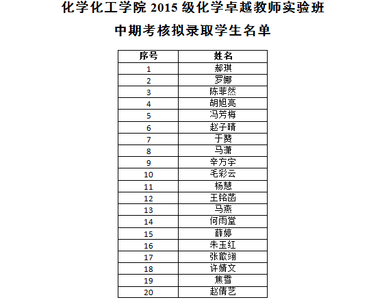 按照《香蕉视频 卓越教师实验班中期考核、二次选拔实施办法》、《香蕉视频 2015级卓越教师实验班中期考核、二次选拔考核方案》,学院对2015级卓越教师实验班学生进行了中期考核,通过考核,拟录取学生名单如下: