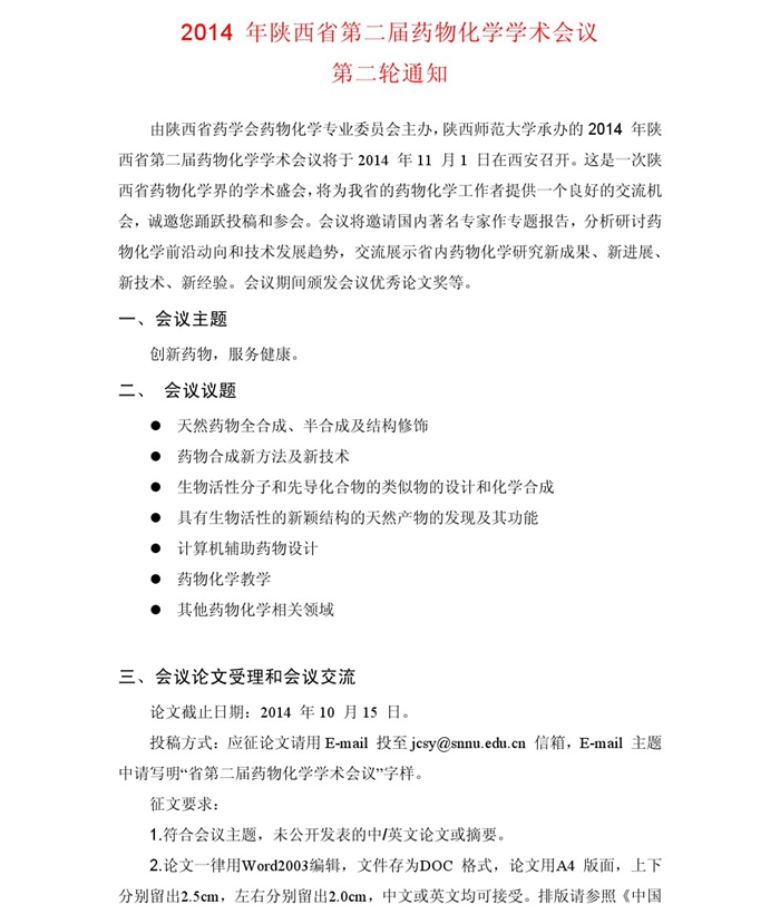 2014 年陕西省第二届药物化学学术会议(第二轮通知)