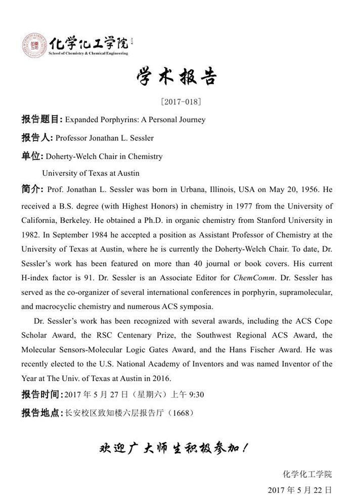 Jonathan L. Sessler教授学术报告预告[2017-018]