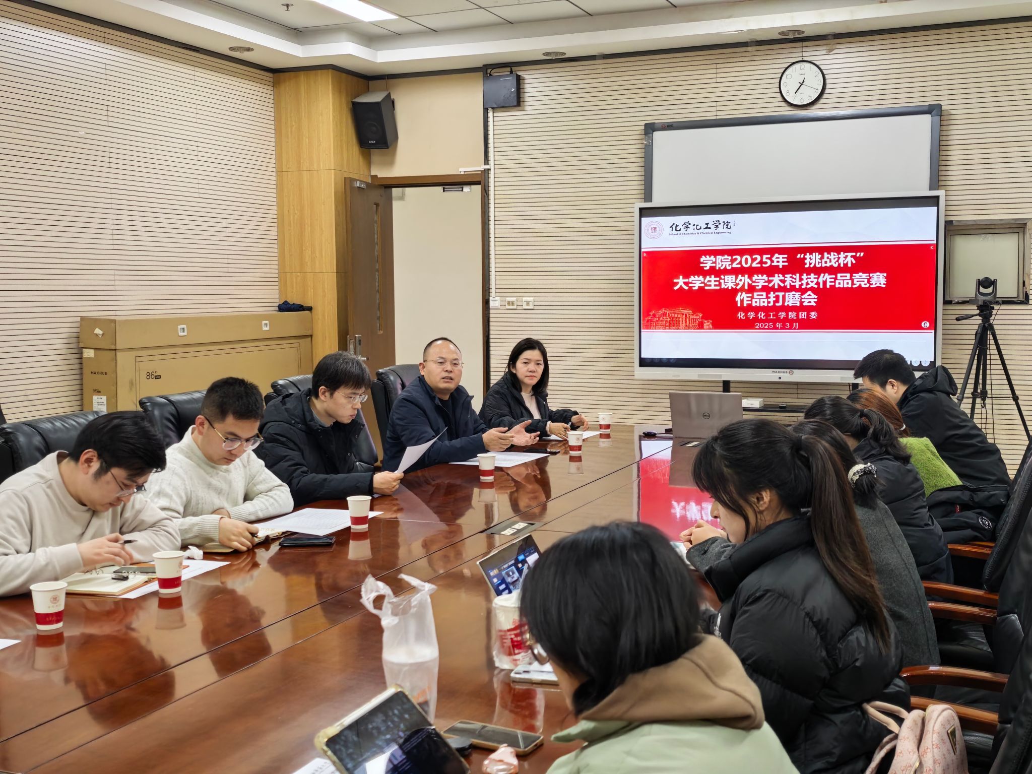 学生的创新精神和实践能力,做好学院2025年“挑战杯”大学生课外学术科技作品竞赛,提高参赛项目质量,学院于3月4日晚在致知楼1362会议室召开2025年“挑战杯”大学生课外学术科技作品竞赛作品打磨会。