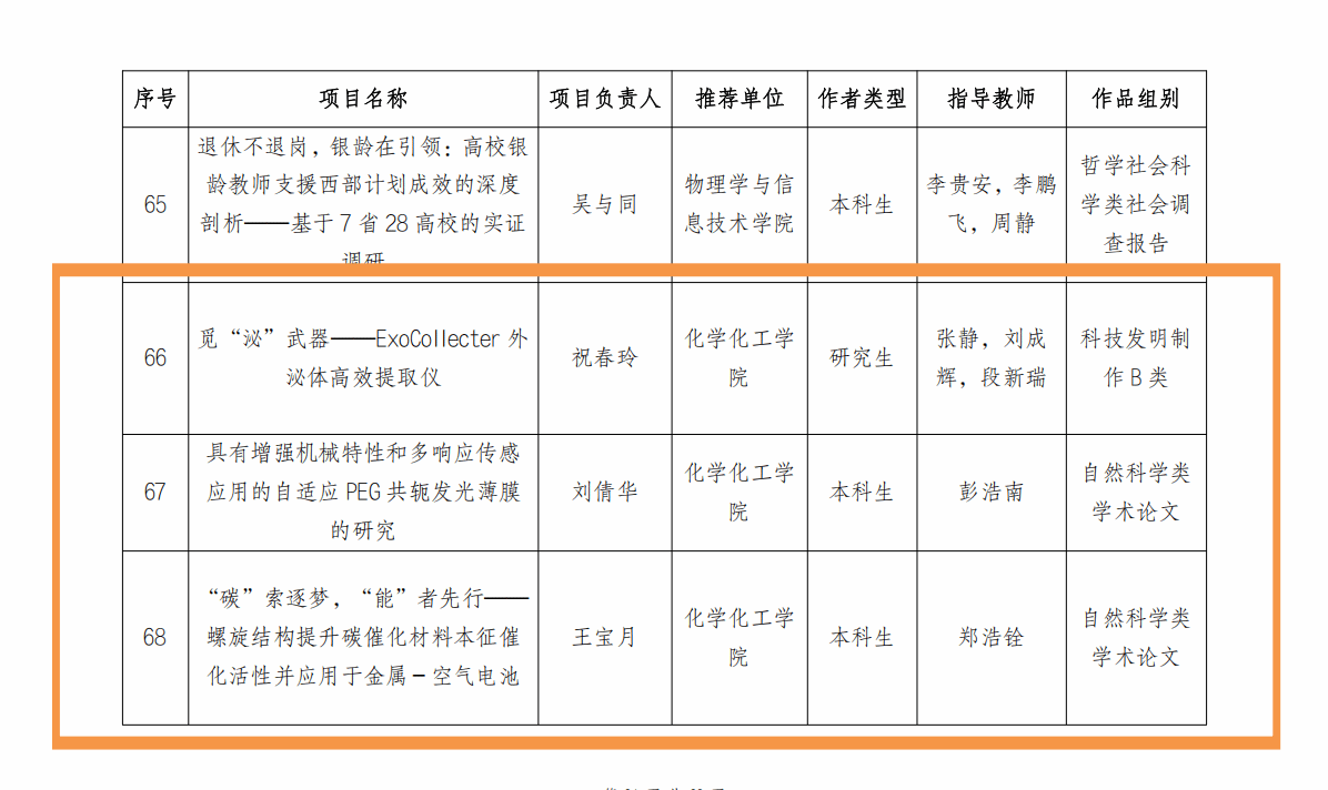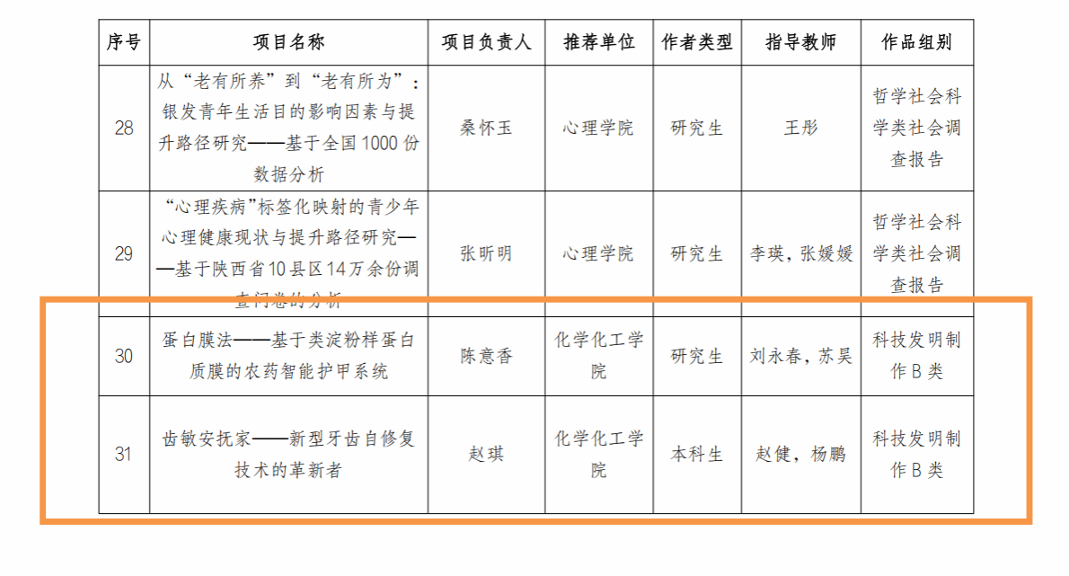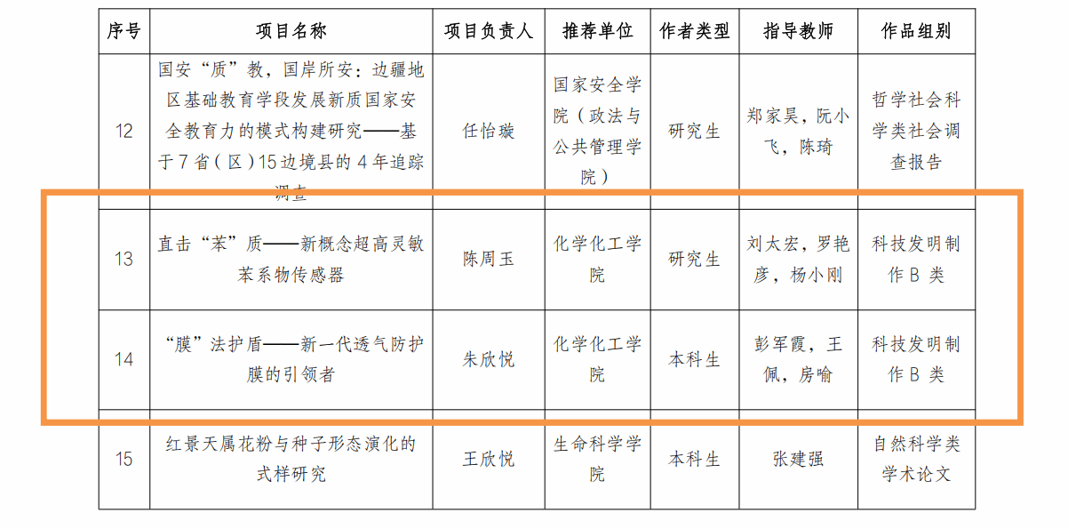 其中,由刘太宏教授等指导的研究生项目《直击“苯”质——新概念超高灵敏苯系物传感器》与彭军霞教授等指导的本科生项目《“膜”法护盾——新一代透气防护膜的引领者》荣获一等奖;由刘永春副教授指导的研究生项目《蛋白膜法——基于类淀粉样蛋白质膜的农药智能护甲系统》和赵健副教授等指导的本科生项目《齿敏安抚家——新型牙齿自修复技术的引领者》荣获二等奖;由张静教授等指导的研究生项目《觅“泌”武器——ExoCollecter外泌体高效提取仪》、彭浩南教授指导的本科生项目《具有增强机械特性和多响应传感应用的自适应PEG共轭发光薄膜的研究》以及郑浩铨教授指导的本科生项目《“碳”素逐梦,“能”者先行——螺旋结构提升碳催化材料本征催化活性并应用于金属-空气电池》荣获三等奖。