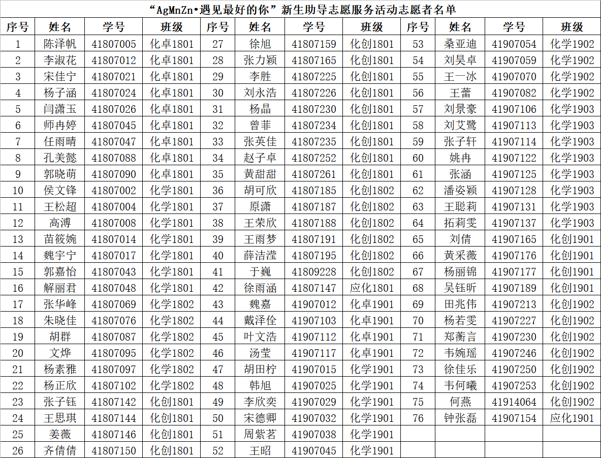 根据《关于公开招募香蕉视频 “AgMnZn•遇见最好的你”新生助导活动志愿者的通知》要求,按照香蕉视频 “AgMnZn·遇见最好的你”新生助导活动志愿者招募条件,通过公开招募、自愿报名、择优录取,拟定陈泽帆等76名同学为活动志愿者,现予以公示。