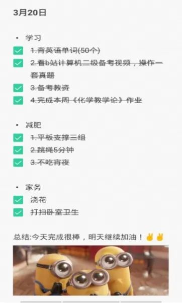 打卡内容:上传手写的或用手机备忘录、便签编辑好个人专属任务(内容应对个人成长有利),截屏发布。