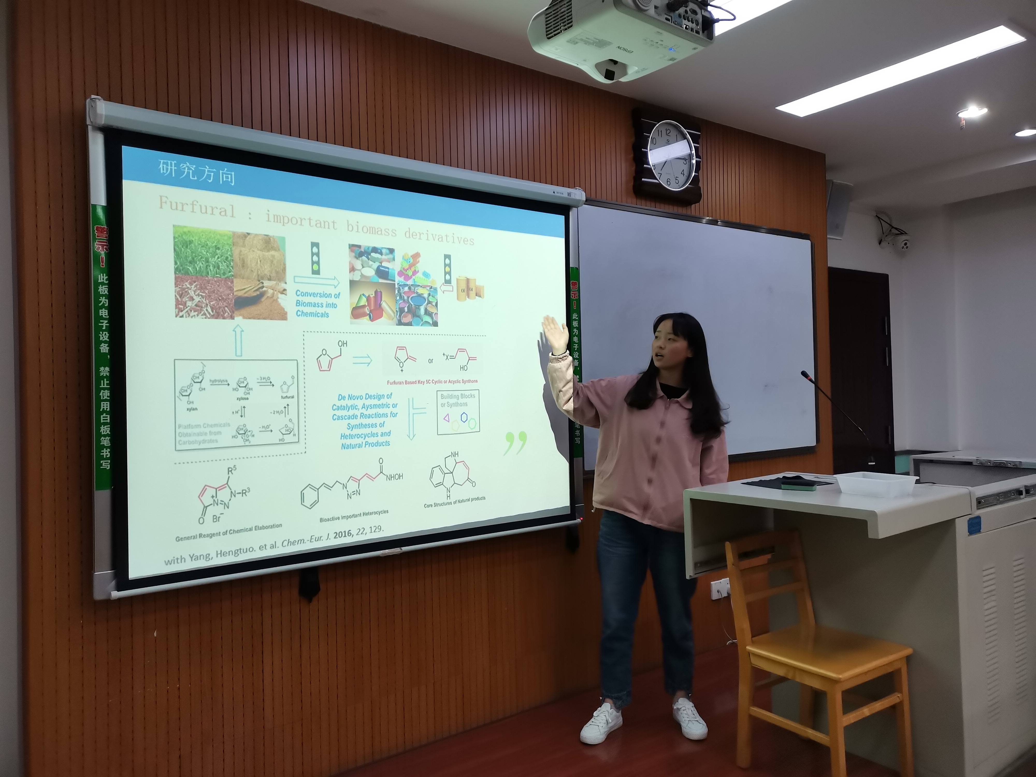 其中,点评环节中,两位评委提出的问题充分验证了“细节决定一切”这句话,从汇报展示中侧重部分的取舍,PPT制作中背景的选择、布局的分配、字体类型的选用、字体大小,到更加细节的文献引用格式,Chemdraw中分子式导出图片的大小,错别字问题等方面给大家提出建议,同学们纷纷表示收获不少。
