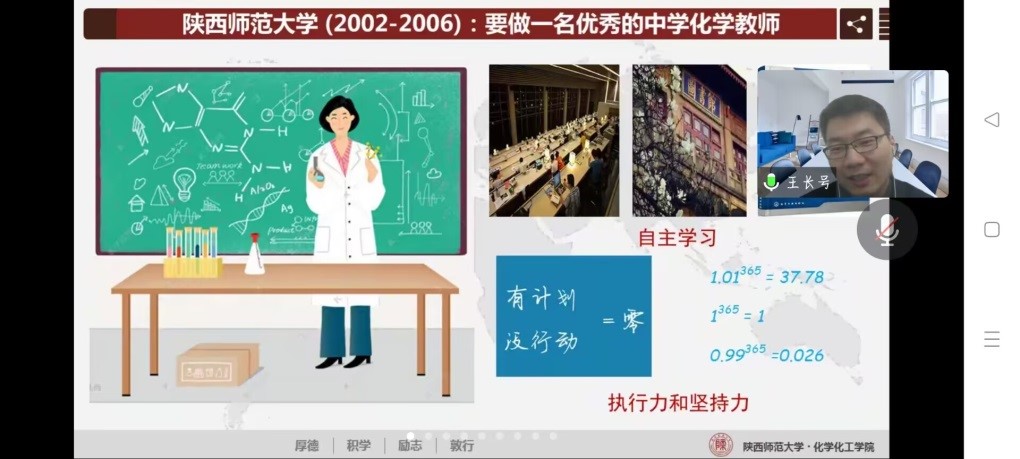 习近平总书记说过:“时代总是把历史责任赋予青年。”新时代的中国青年,生逢其时、重任在肩,施展才干的舞台无比广阔,实现梦想的前景无比光明。为鼓励同学们把握当下,不负韶华,奋斗其时,11月25日,2021级化学卓越班、笃学班邀请2022年国家优青基金项目获得者王长号教授作线上专题报告。2021级卓越班项目主任陈亚芍教授,班主任张学鹏副教授,2021级化学卓越班、笃学班全体同学参加活动。本次报告由张学鹏老师主持。