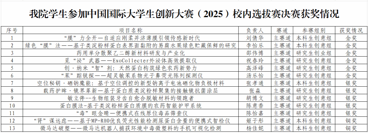 为深入落实习近平总书记关于教育的重要论述和习近平总书记给中国国际大学生创新大赛参赛学生代表的回信精神,提升大学生创新创能力、培养大学生创新创业素养,学校于3月至5月成功举办中国国际大学生创新大赛(2025)校内选拔赛。