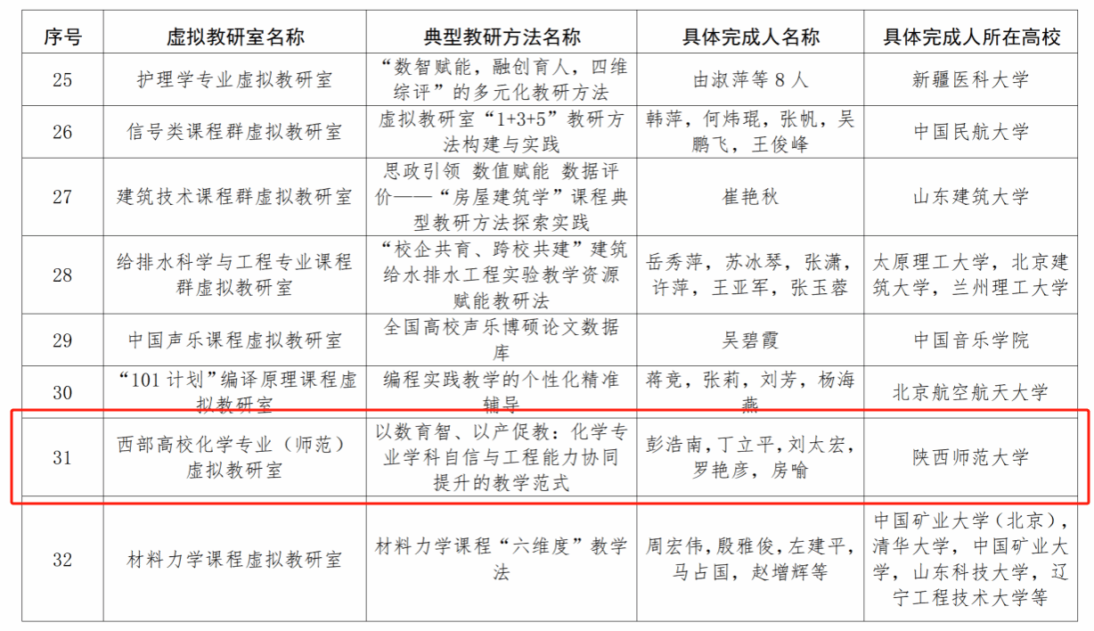 为深入贯彻党的二十届四中全会精神和全国教育大会精神,持续发挥典型示范引领效用,切实加强虚拟教研室建设,全国高等学校教学研究中心受高教司委托,组织开展了2025年度典型虚拟教研室、典型教研方法与典型教研成果“三个典型”评选工作。经过学科协作组推荐和专题工作组专家论证,由房喻院士担任负责人的香蕉视频 国家级“西部高校化学专业(师范)虚拟教研室”报送的“以数育智、以产促教:化学专业学科自信与工程能力协同提升的教学范式”(主要完成人:彭浩南、丁立平、刘太宏、罗艳彦、房喻),荣获2025年度典型教研方法。