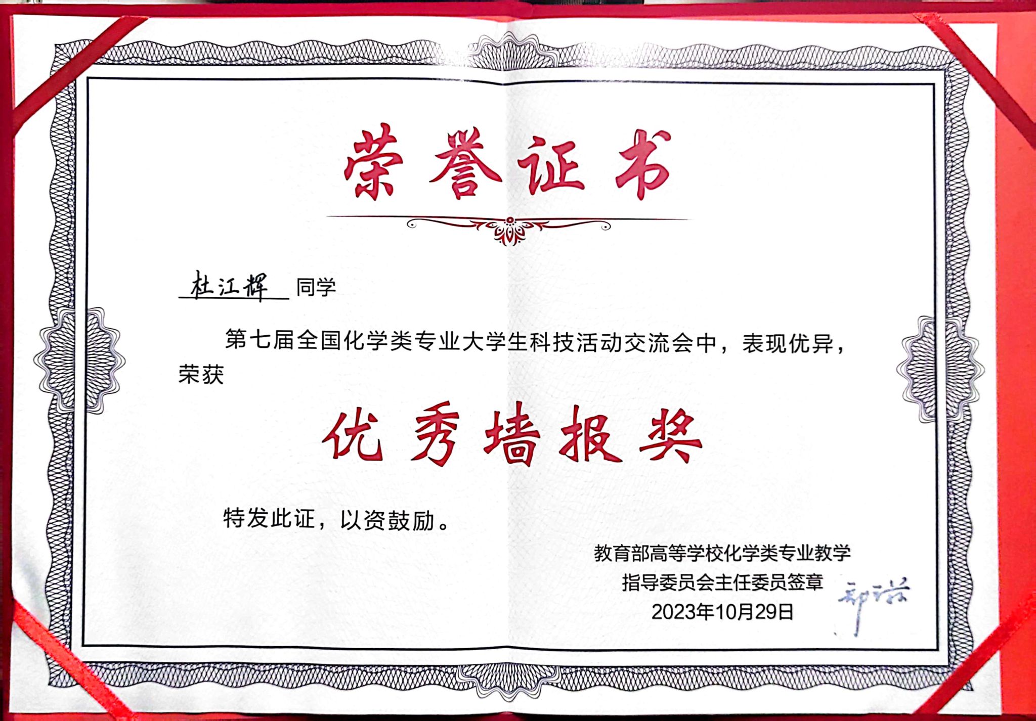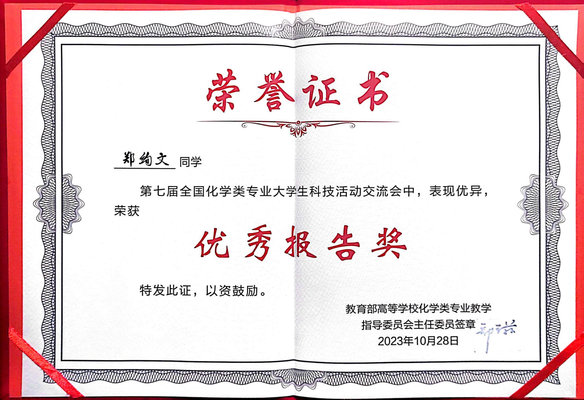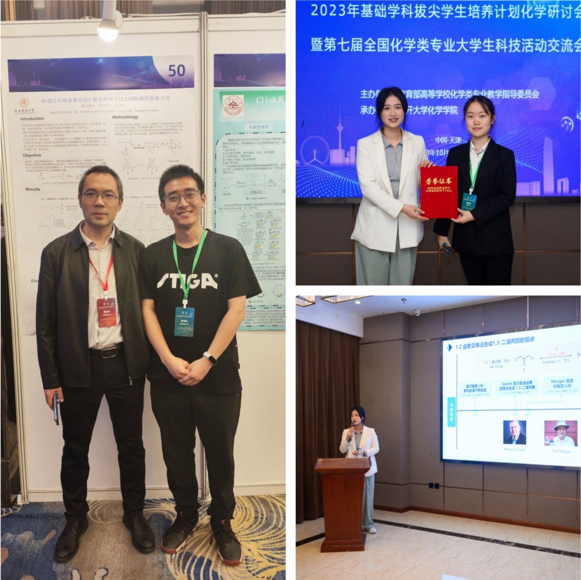 教师黄治炎和2020级本科生郑绚文、李伯达参加了此次交流活动,展示了自己的科研训练成果,与来自各重点高校的同学们进行了积极交流,并取得了优异成绩。郑绚文同学所作的题为"卤素交换法绿色合成1,3-二溴丙酮"的口头汇报荣获“优秀报告奖”,杜江辉同学展示的题为《一种通过均相金催化的2-氨基吡咯并[1,2-b]哒嗪的制备方法》的墙报荣获“优秀墙报奖”。