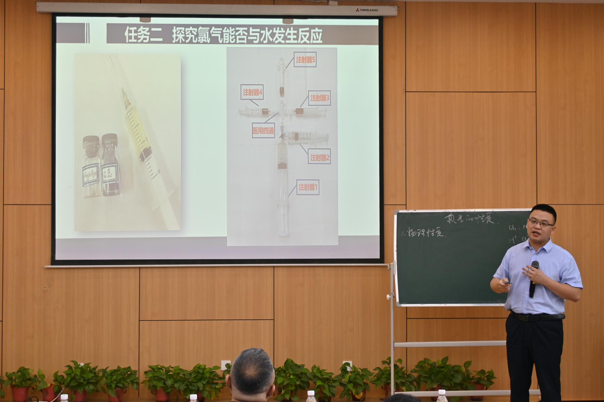 陕师大附中高级教师、西安市教学能手罗春老师为同学们讲授了一堂生动而富有启发性的《氯气的性质》示范课。课堂上,罗老师以其丰富的教学经验和深厚的化学知识,通过创设情境法、实验演示法、小组合作探究等教学方法,生动展示了氯气的性质及其在化学反应中的作用。罗老师还分享了本节课的教学设计思路,帮助同学们学习多种教学方法、新教学思路、创新实验的改进,这将为同学们未来踏上教师岗位奠定了坚实的基础。