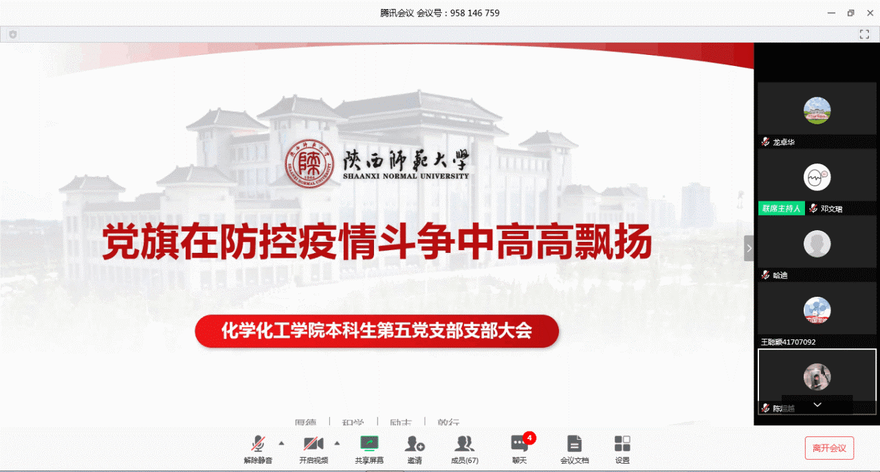 本科生第五党支部于4月12日晚上7点通过腾讯会议平台召开以 “党旗在防控疫情斗争中高高飘扬”为主题的线上学习会议。本次会议由支部书记翁思洁主持,支部组织委员龙卓华、支部宣传委员邓文珺以及支部全体党员参加会议。