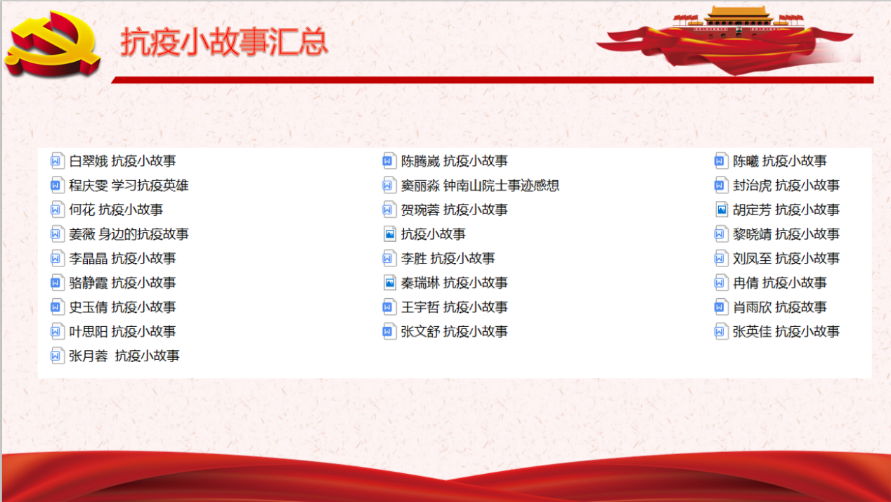 第二部分,党支部依托腾讯会议平台,组织支部党员对身边发生的抗疫小故事进行分享。李汶颖同志分享了家人作为湖南本地第一批抗疫护士,奋战一线的英勇事迹;刘国强同志分享了假期期间,学校为保障师生安全,积极做好防控工作的事迹;魏济明同志分享了2020届毕业生谭秋慧为基层防疫助力,主动前往社区服务站成为志愿者的事迹。会议之后,一部分同志将自己的故事和感想制作成文档进行了分享。