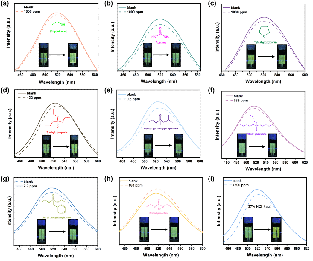 图5.MOF薄膜在接触多种有机蒸气及HCl蒸气前后的荧光发射光谱。