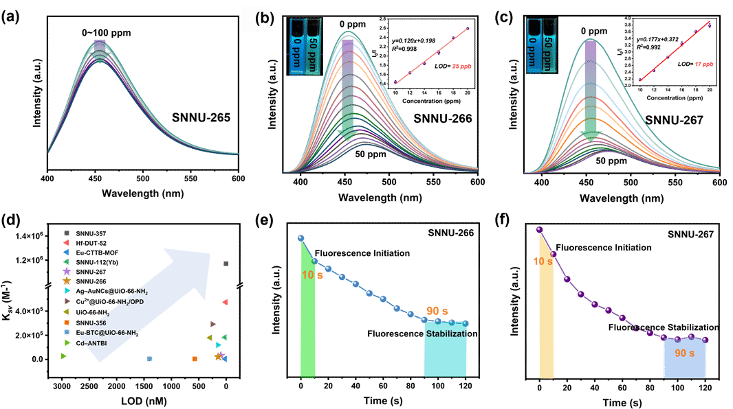 总的来说本研究通过孔空间分区策略,在镁基MOF中实现供体-受体的精准空间排布,构建质子化诱导的TSCT传感平台。SNNU-266与SNNU-267中的氨基在DCP作用下质子化形成-NH3+受体,与TPPA供体发生高效TSCT,导致荧光猝灭与红移,在液/气相中均实现DCP的超灵敏检测(液相LOD 0.017 ppm、气相LOD 0.04 ppm),响应时间<10秒且循环稳定。该工作不仅证实PSP策略对MOF中TSCT的精准调控能力,还为神经性毒剂模拟物的快速、超灵敏检测提供实用化方案,为荧光传感机制调控与危险化学品检测材料的设计提供“结构分区-机制调控-性能优化”的系统范式。