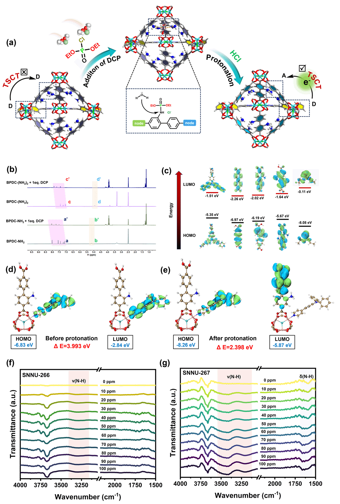 综合结构、光谱与理论分析结果表明,MOF在DCP作用下框架保持稳定,氨基被质子化生成–NH3⁺受体。质子化导致LUMO转移至二羧酸配体,能隙显著缩小,促进跨空间电荷转移(TSCT)过程。热力学分析证实MOF–DCP相互作用为自发放热过程,而荧光寿命基本不变,排除了PET机制,进一步验证了质子触发的TSCT主导传感机理。