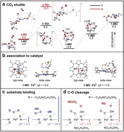 为了更好地理解1在提高FeTPP电催化CO2RR中的关键作用,我们进行了密度泛函理论(DFT)计算来阐明催化过程。首先,研究了1和CO2之间的反应。1可以捕获一个CO2分子生成烷基碳酸氢酯1-IM1,活化自由能垒仅为6.4 kcal/mol、放热自由能为−3.9 kcal/mol。接着,我们研究了CO2与1的结合物和FeTPP之间的相互作用。通过相互作用区域指示(IRI)分析可知,1-IM1和1-IM3与Fe0之间存在明显的范德华力和氢键相互作用。综上这些结果表明,1可以作为shuttle捕获二氧化碳分子,并将其带到催化活性位点。最后,研究了底物分子在催化活性Fe0位点的活化过程。计算结果表明,催化底物以游离CO2分子的形式与催化剂反应,结合自由能垒为3.9 kcal/mol。1除了起shuttle作用之外,当碳酸氢酯1-IM3作为质子源时,C−O断键的自由能垒可以降低至2.8 kcal/mol。