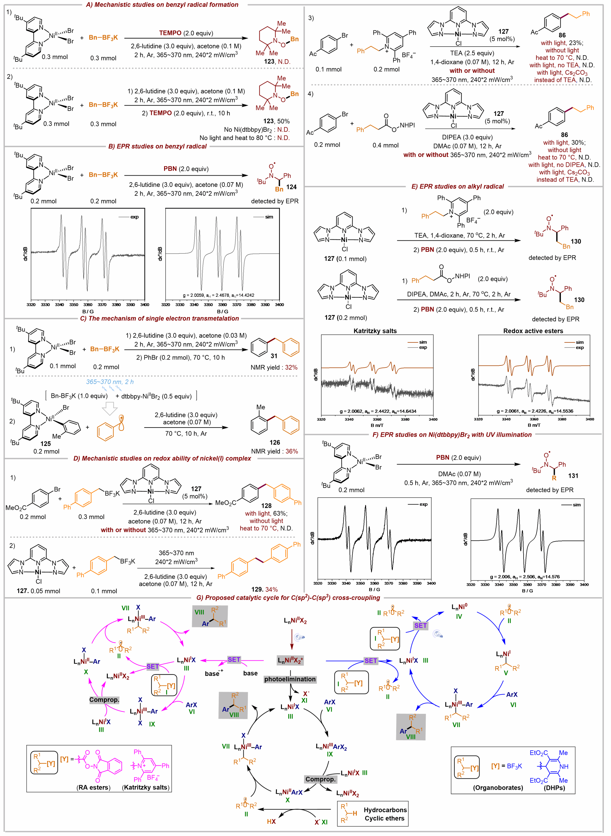 为了深入了解反应机理,团队进行了一系列控制实验和机理研究。实验结果表明:镍催化剂在反应中起着不可替代的多重作用,既能激活C(sp3)自由基前体和卤代芳烃,又参与了整个反应过程。在光照射下,镍(II)配合物与不同的C(sp3)自由基前体发生单电子转移过程,生成烷基自由基和低价镍物种,随后经过一系列反应包括氧化加成、单电子转金属化及还原消除等,最终实现C(sp2)-C(sp3)键的构建。值得注意的是,镍(I)配合物是催化C(sp3)前体生成烷基自由基的关键中间体。通过合成已报道的Ni(I)配合物进行控制实验以及EPR实验,进一步成功捕获产生的烷基自由基。在该光促进镍催化体系中,多种自由基前体产生自由基的方式不同:对于有机三氟硼酸盐和14-二氢吡啶,通过光激发后的Ni(I)配合物氧化产生;对于氧化还原活性酯和Katritzky盐,通过Ni(I)配合物还原产生;对于烃类和环醚,则是通过激发态Ni(II)配合物的镍卤键均裂所生成的卤素自由基介导的氢原子转移过程。
