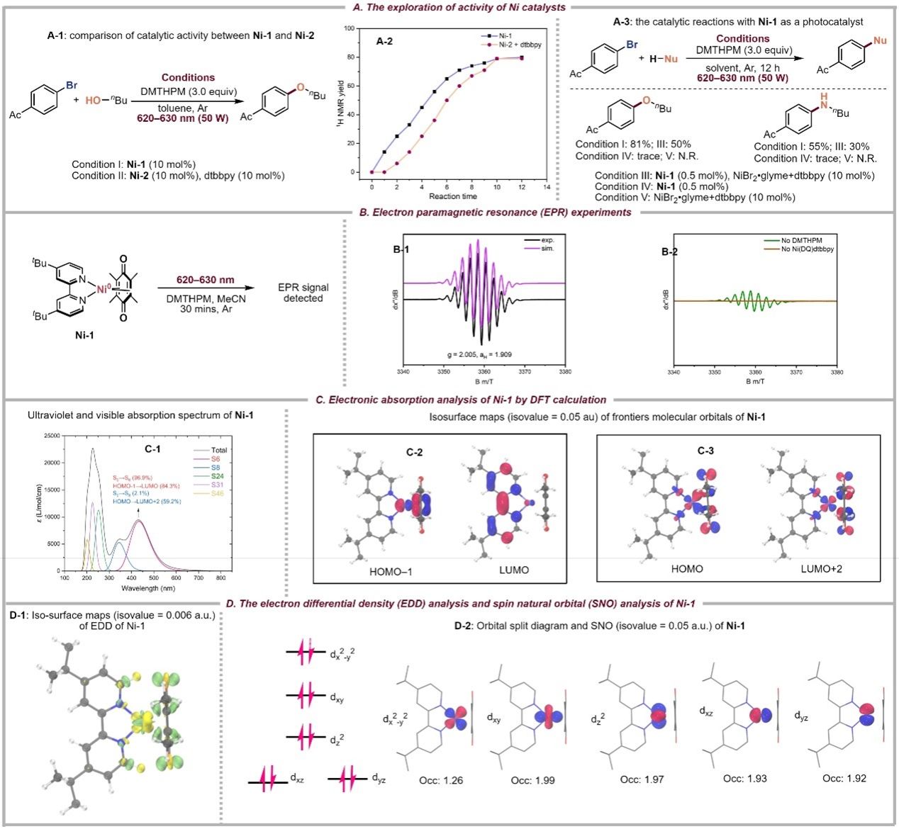 在探索红光激发下Ni(0)(DQ)dtbbpy催化机制方面,通过DFT计算阐明HOMO-LUMO轨道分布(HOMO-1位于醌环,LUMO在联吡啶),揭示了红光吸收的分子机制;电子顺磁共振(EPR)实验证实光照下生成苯半醌阴离子自由基,阐明了电子转移路径。Ni(0)(DQ)dtbbpy在红光照射下能够形成激发态的Ni(0)络合物,部分解离生成游离DQ和活性Ni(0)dtbbpy催化剂。值得注意的是,由于Ni(0)(DQ)dtbbpy展现出双功能催化剂的独特优势,既可作为光收集的光敏剂,也可作为介导键形成的金属催化剂。