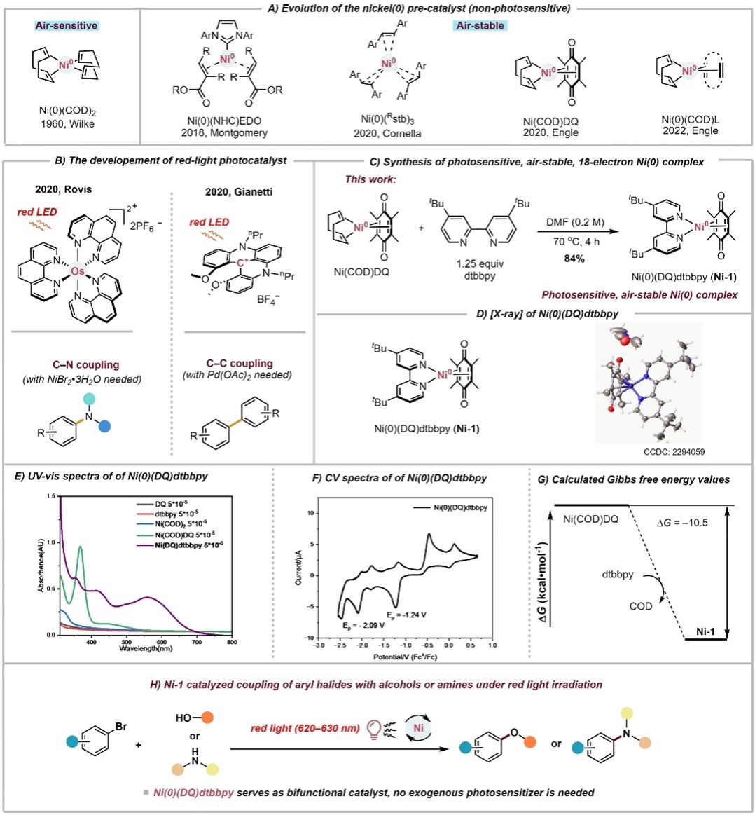近日,绿色催化与合成团队薛东教授基于前期的研究基础(Angew. Chem. Int. Ed. 2020, 59, 12714; Angew. Chem. Int. Ed. 2021, 60, 5230; Angew. Chem. Int. Ed. 2021, 60, 21536; Angew. Chem. Int. Ed. 2024, 63, e202314355;J. Am. Chem. Soc. 2024, 146, 26936),成功合成并表征了一种新型双功能、空气稳定且对光敏感的镍(0)络合物 Ni(0)(DQ)dtbbpy(dtbbpy = 4,4’-二叔丁基-2,2’-联吡啶,Ni-1)。该镍(0)络合物在空气中可稳定储存数日,具有较高稳定性。该镍(0)络合物Ni(0)(DQ)dtbbpy展现出了独特的光敏性,在红光(620-630 nm)照射下,可以催化芳基溴化物与醇和胺的醚化和胺化反应。Ni(0)(DQ)dtbbpy起着作为光催化剂和活性金属催化剂的双重作用。与传统的短波长光(如紫光、蓝光)参与反应相比,该前催化剂能在红光(更低能量和更高穿透度)照射下展示出高的催化活性,从而能抑制各种副反应产生并使反应表现出广泛的底物普适性,这突显了Ni(0)(DQ)dtbbpy作为双功能、红光敏感催化剂在合成化学中的应用潜力。