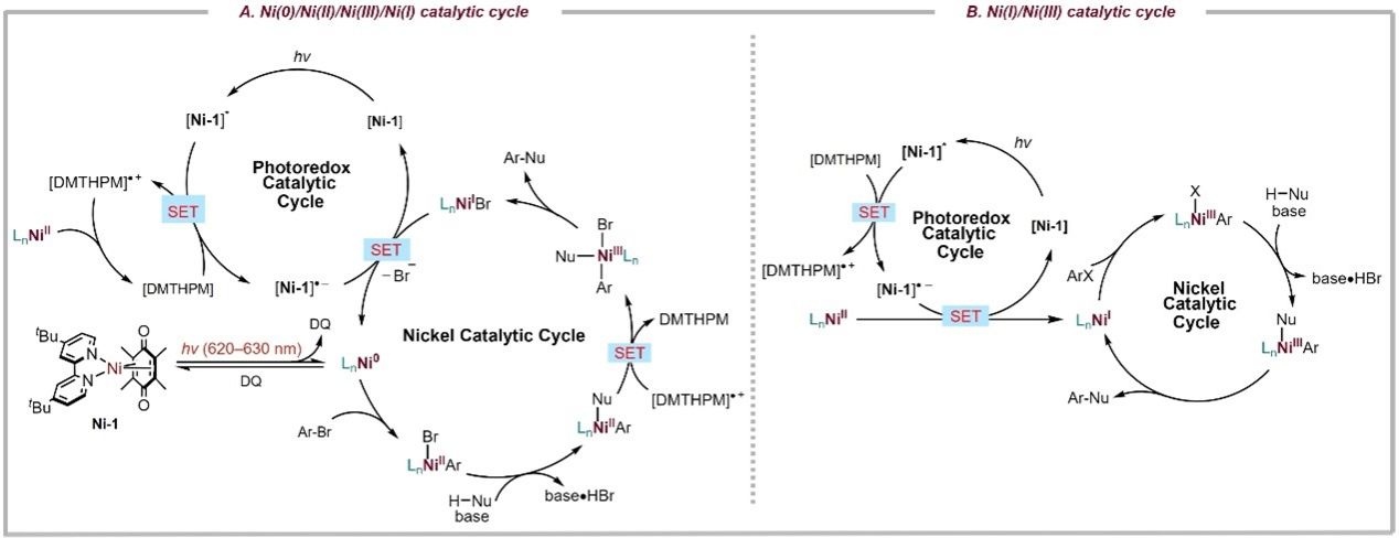 基于机理研究实验和文献报道,提出了可能存在的Ni(I)/Ni(III)催化循环过程:18电子镍(0)前催化剂Ni(0)dtbbpy在红光照射下解离生成活性Ni(0)中间体,该物种随后与芳基溴化物发生氧化加成,形成ArNi(II)Br络合物;进而与亲核试剂发生配体交换,生成ArNi(II)Nu络合物。同时,激发态的Ni(0) 前催化剂氧化DMTHPM(1,2-dimethyl-1,4,5,6-tetrahydropyrimidine),生成[Ni(0)(DQ)dtbbpy]•−和[DMTHPM]•+,后者氧化ArNi(II)Nu络合物,形成Ni(III)中间体,最终通过还原消除生成偶联产物和Ni(I)物种。Ni(I)物种通过与[Ni(0)(DQ)dtbbpy]•−的单电子转移,再生Ni(0),完成催化循环。