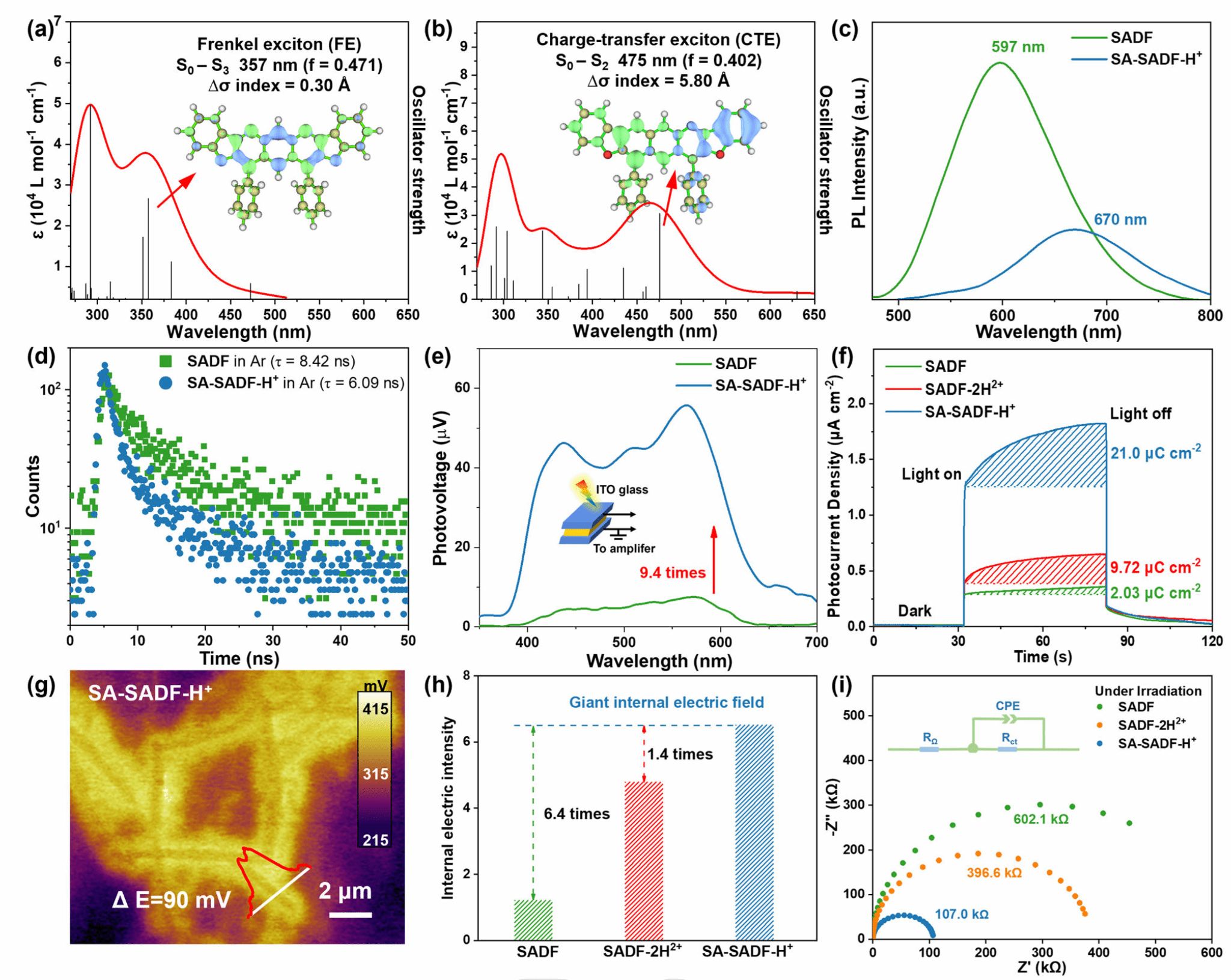 利用TD-DFT和电子-空穴激发分析,进一步研究了SADF和SA-SADF-H+激发态下的电子空穴分布(图2a-2b),SADF的电子跃迁为弗伦克尔激子(FEs),SA-SADF-H+的电子跃迁主要为电荷转移激子。相比于SADF,SA-SADF-H+的PL发射光谱明显红移且强度降低,在氩气氛围下具有更短的PL寿命,表明不对称质子化时电荷分离和传输有明显的增强。实验结果表明非对称质子化后材料内建电场的大幅增强(图2e-图2i)。谱学分析表明,与氩气氛围下相比,在空气下SA-SADF-H+的EAS信号显著增强,以及PL寿命的显著降低,进一步证明了非对称质子化促进了光催化剂和O2分子之间有效的光诱导电荷转移,从而利于光催化产过氧化氢。