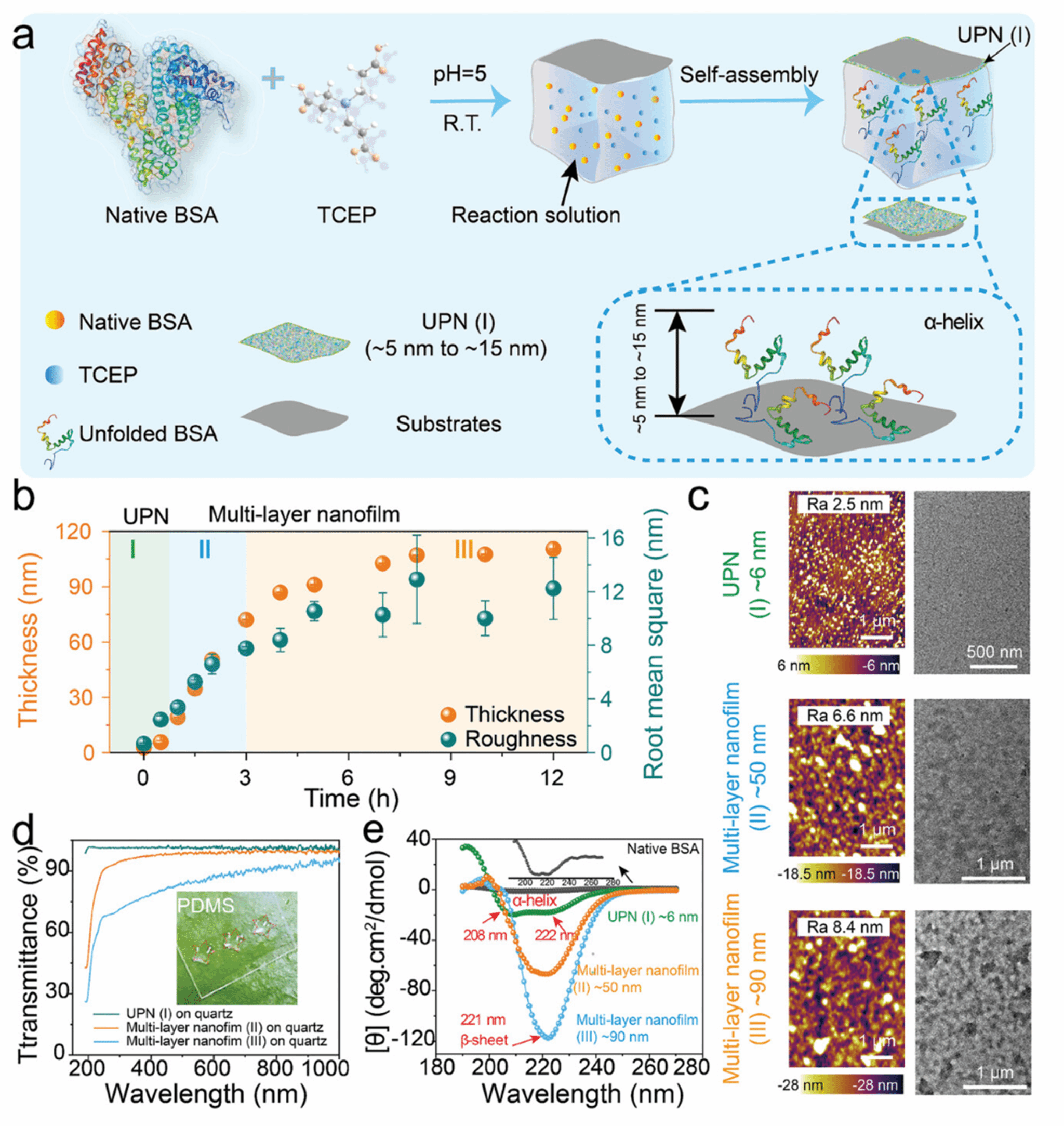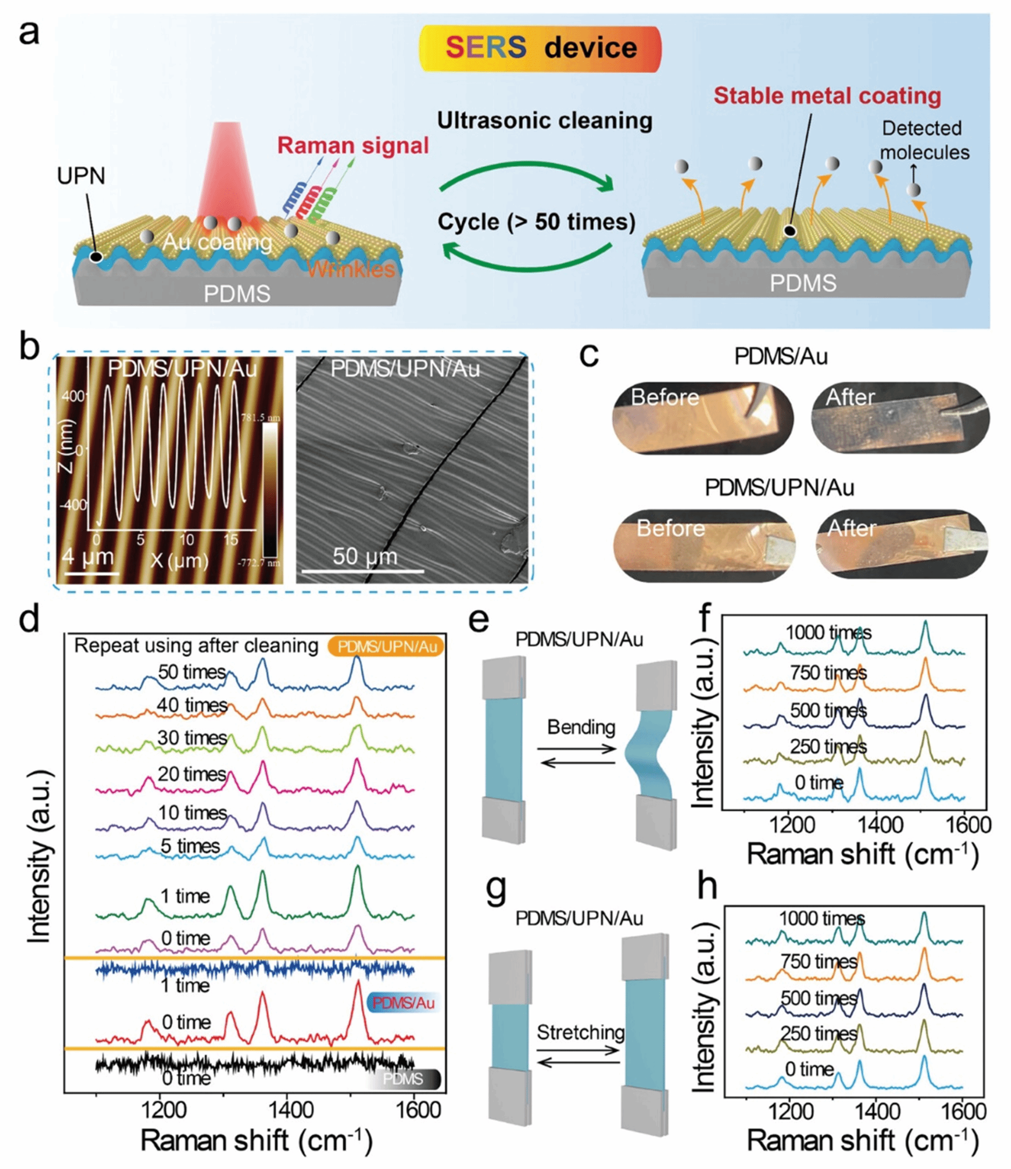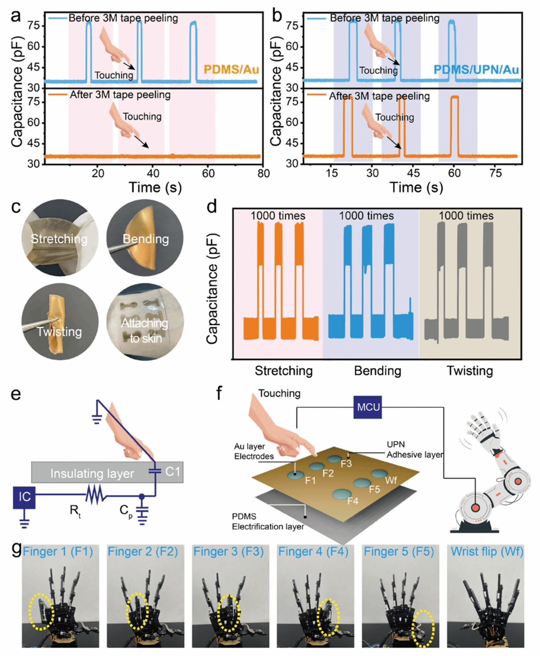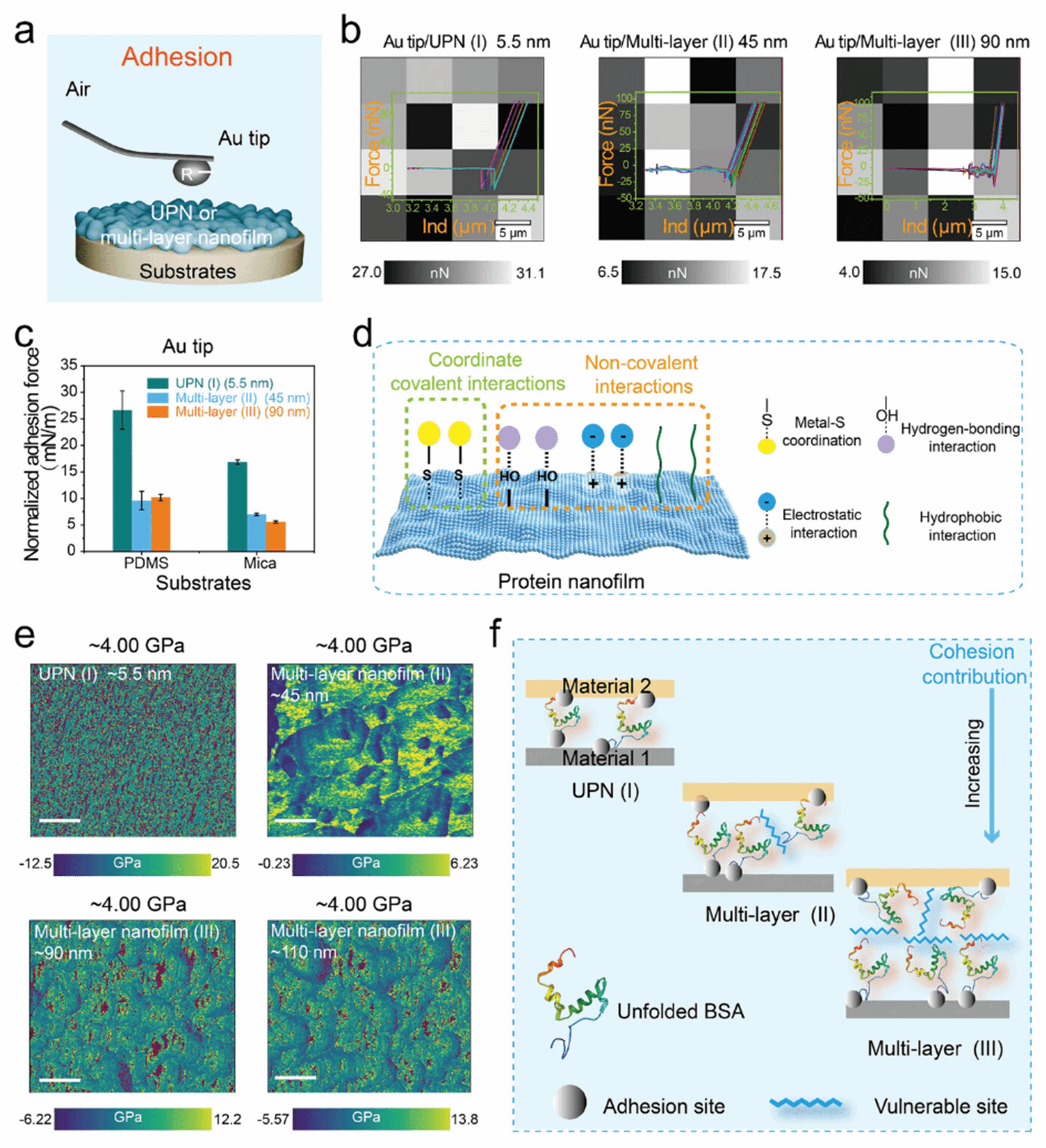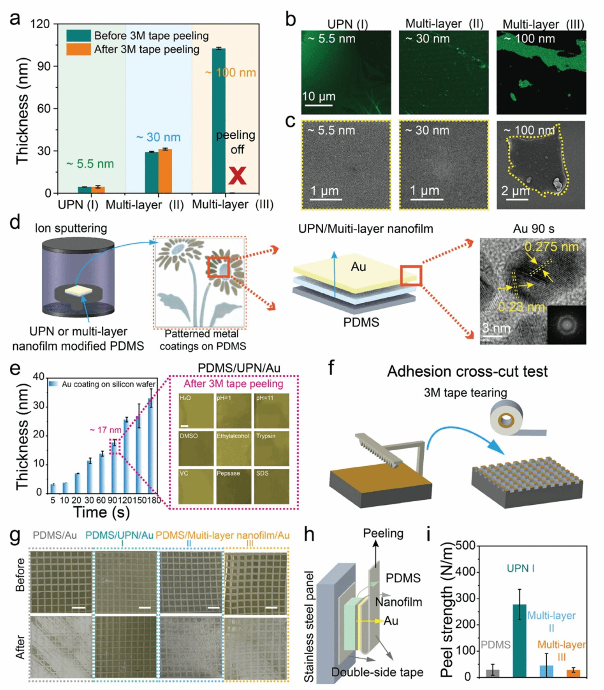 近期,生物表界面与智能大分子研究团队提出了一种由二硫键还原蛋白聚集合成的超薄蛋白质纳米膜 (UPN) 作为强粘合层,用来增强聚合物基材与金属涂层之间的粘附力。与具有微米级厚度的传统生物聚合物胶粘剂不同,UPN 层最小化到纳米/单分子尺度。因此,这种 UPN 通过直接连接两个几乎单分子厚度的界面,有效地提高了界面粘合强度,并降低了整个粘合系统中的内聚力贡献(图1)。使用 UPN 作为粘合层,多功能金属涂层可以通过离子溅射可靠地粘附在柔性聚合物基材上,即使在重复的机械变形下也能提供前所未有的粘合稳定性。(图2-4)这种设计的应用包括可逆透明度控制、张力响应加密、可重复使用的光学传感(图5)和可穿戴电容式触摸传感器(图6)。这项工作突出了 UPN 在柔性聚合物和金属涂层之间产生强大粘合强度的潜力,提供具有高表面活性和低内聚力的生物相容性解决方案,促进具有稳定金属纳米涂层的混合器件的开发。