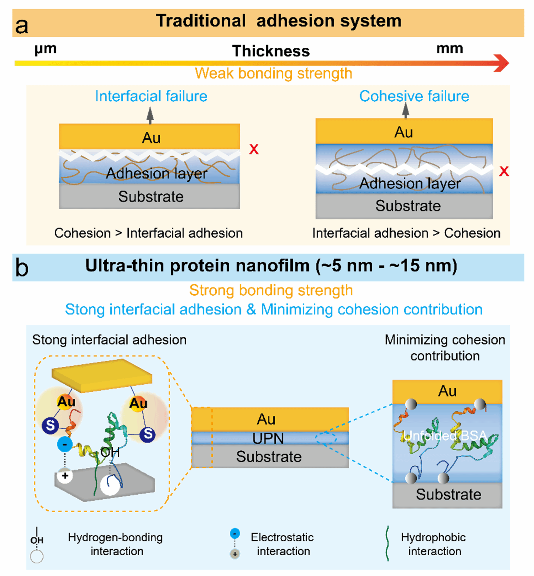 1  传统黏附和超薄蛋白纳米膜(UPN)黏附模型的区别