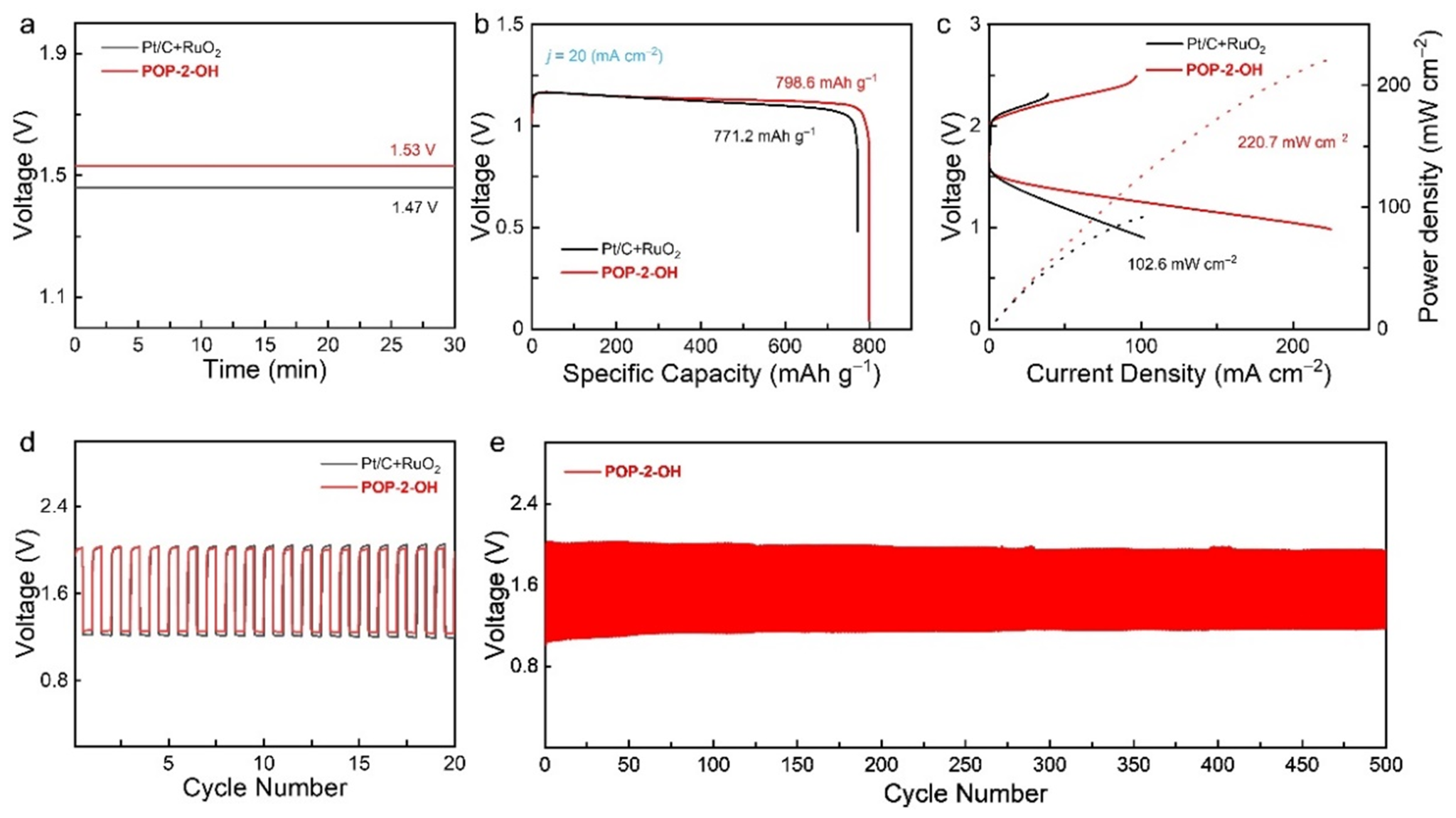 POP-2-OH对ORR和OER都具有高活性,我们用其组装了锌空气电池。具有POP-2-OH的电池表现出1.53 V的开路电压,而Pt/Ru的电池为1.47 V(图6a)。在j = 20 mA/cm2时,POP-2-OH的电池的比容量为798.6 mAh/g,高于Pt/Ru的电池的比容量(771.2 mAh/g)(图6b)。POP-2-OH的电池可以实现220.7 mW/cm2的最大功率密度,大于Pt/Ru的电池的最大功率密度(102.6 mW/cm2)(图6c)。具有POP-2-OH的电池在j = 2 mA/cm2下表现出0.75 V的充电-放电电压间隙,而对于Pt/Ru的电池则为0.80 V(图6d)。所有这些结果表明,POP-2-OH的电池比Pt/Ru的电池性能更好。并且,POP-2-OH的电池在耐久性测试中显示出良好的循环稳定性(图6e)。