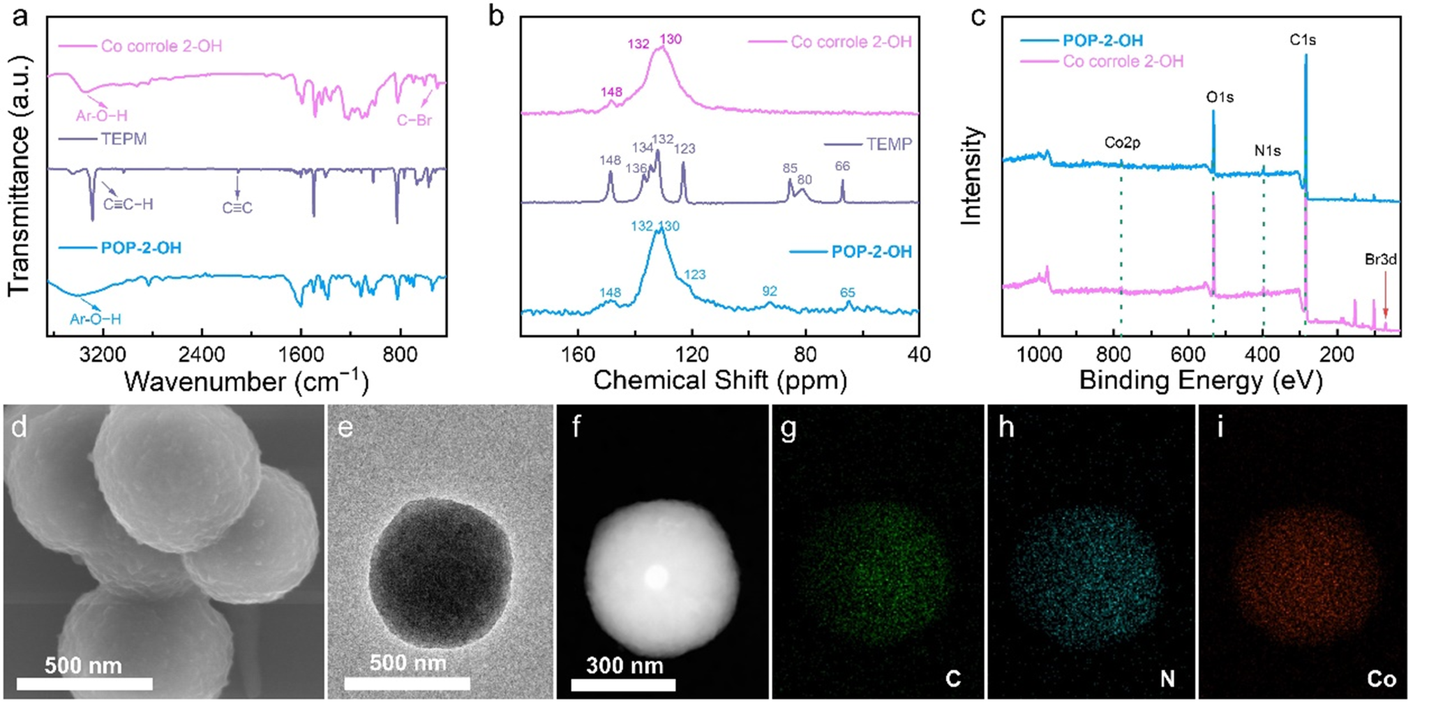 图3. (a) Co corrole 2-OH,TEPM和POP-2-OH的红外光谱和(b)固体核磁共振谱,(c) Co corrole 2-OH和POP-2-OH的X射线光电子能谱,(d) POP-2-OH的扫描电镜和(e)透射电镜图像,(f)高角环形暗场图像和(g-i)对应的元素映射图像