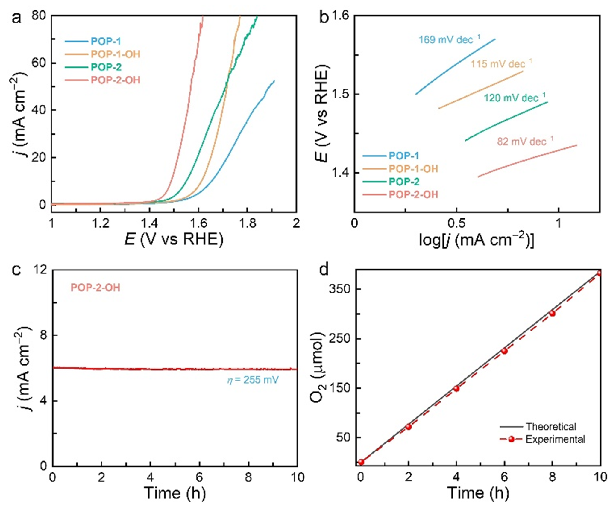 图5. (a) OER lsv和(b) 0.1 M KOH溶液中POP-1、POP-1-OH、POP-2和POP-2-OH的OER Tafel斜率。(c)在ŋ = 255 mV下用POP-2-OH进行OER电解。(d) POP-2-OH电解过程中产生的O2的观察和理论量