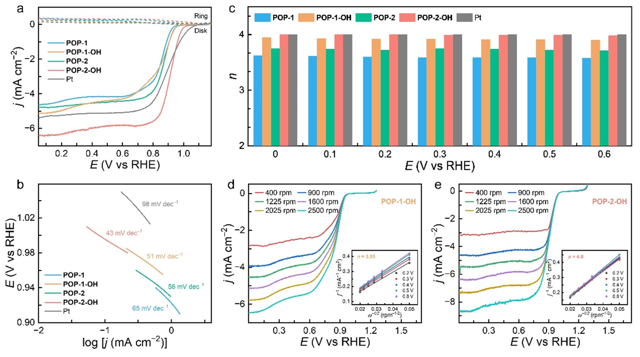 图4. (a)在O2饱和的0.1 M KOH溶液中,1600 rpm转速下POP-1、POP-2、POP-1-OH和POP-2-OH的RRDE数据。(b)通过RRDE获得在0.1 M KOH溶液中POP-1、POP-2、POP-1-OH和POP-2-OH的ORR的转移电子数(n)值。(c) POP-1、POP-2、POP-1-OH和POP-2-OH的Tafel斜率。(d-e)在0.1 M KOH溶液中不同转速下的POP-1-OH和POP-2-OH的RDE数据。条件: GC圆盘电极(面积0.125 cm2),Pt环电极(面积0.188 cm2),扫描速率5 mV s‒1(插入图: K-L图)