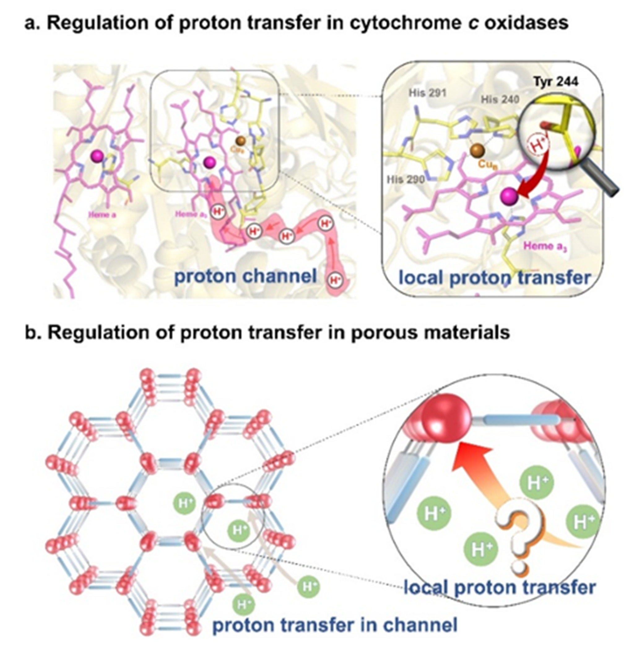 图1. CcOs (a)和多孔材料(b)中的质子转移