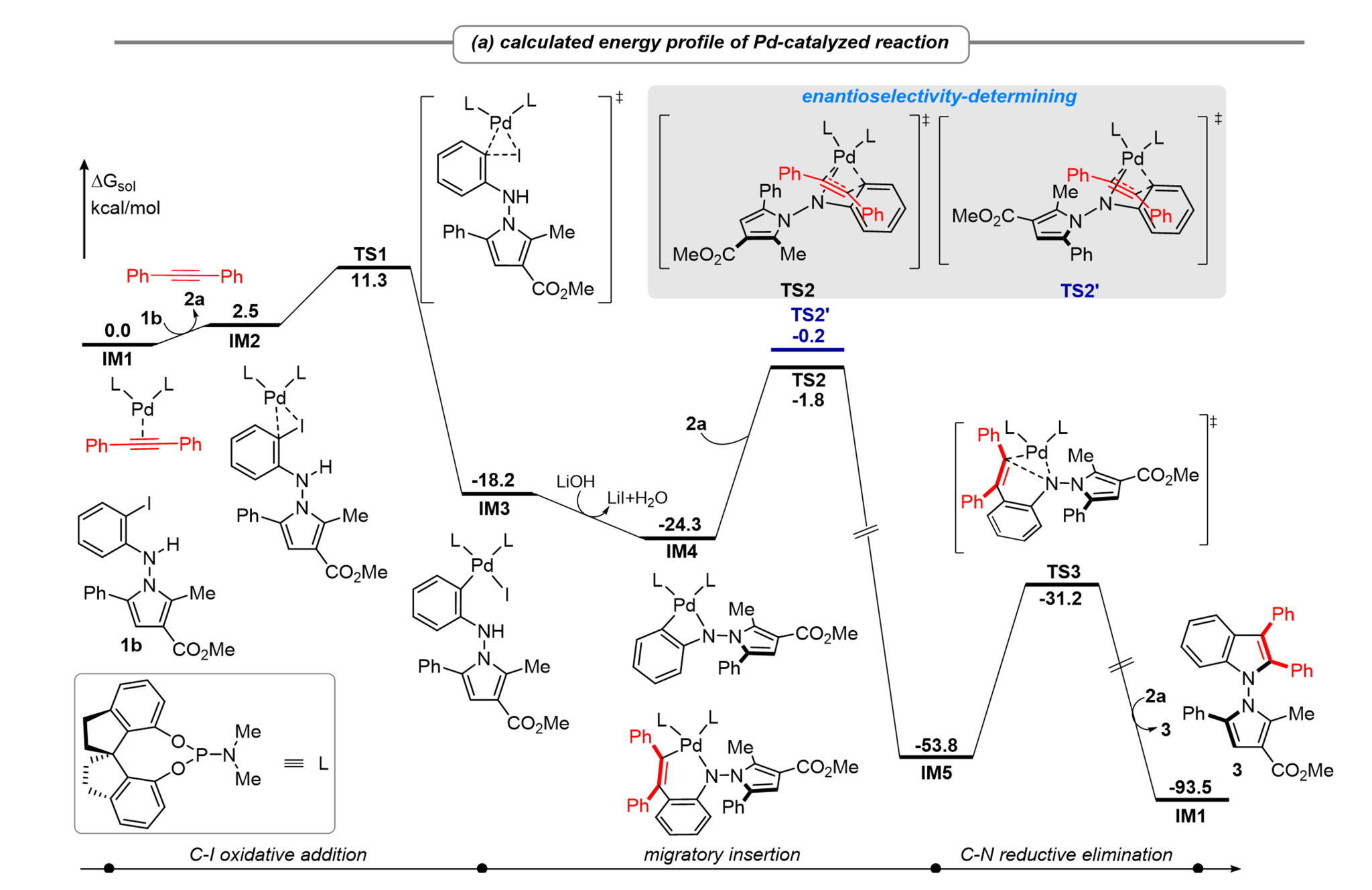 为了更好地阐明反应历程,作者联合天津大学黄根平课题组对反应的过程进行了相应的理论计算(图5),反应依次经历C-I氧化加成、炔烃迁移插入和C-N还原消除的反应历程,并确立了炔烃迁移插入为反应的立体决定步,C-N还原消除为反应的决速步。