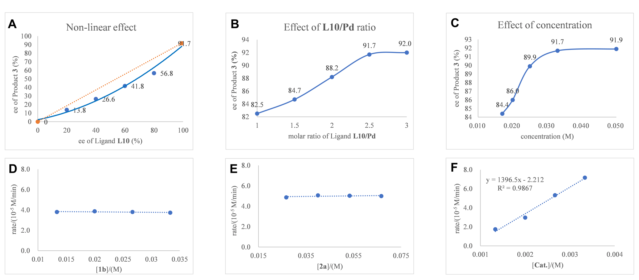 为了探究不对称Larock反应体系中单齿亚膦酰胺配体在反应中的作用,作者进行了一系列的探究实验(图4)。动力学实验结果表明,该反应对于N-吡咯邻碘苯胺和二苯乙炔都是零级反应,对于催化剂Pd(acac)2则为一级反应,说明C-N的还原消除可能是反应的决速步。