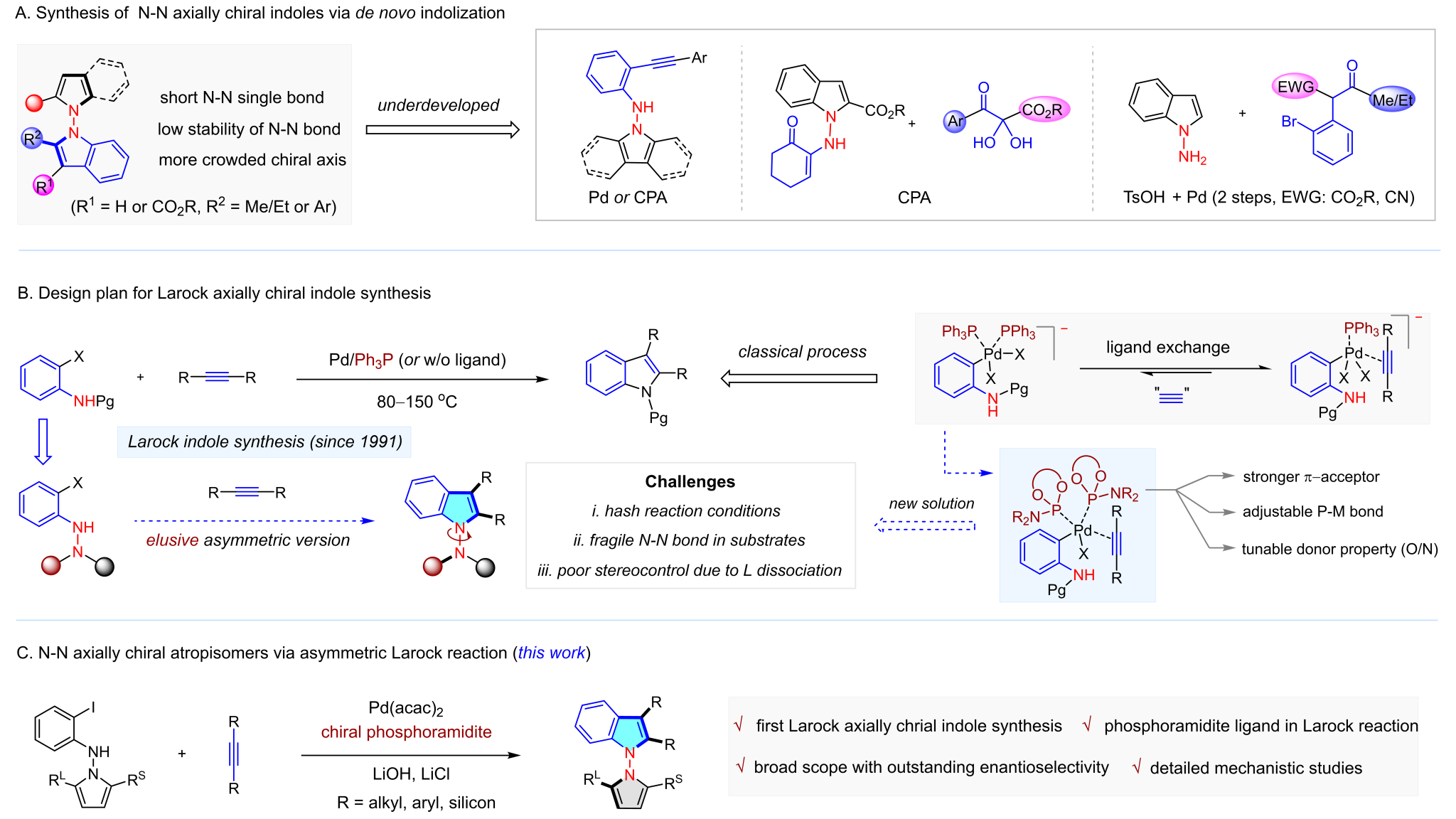 自2021以来,化学家们报道了少数通过吡咯/吲哚的有机催化N-H官能团化、Lewis催化去对称化以及从头构建的策略,实现了N-N阻转异构体的阻转选择性构建。虽然已经取得了这些进展,但相关的反应类型和催化体系仍较为局限,如大多数示例参考了类似C-N轴手性构建的报道,通过分子内成环构建吲哚分子。目前,利用过渡金属催化分子间合成吲哚环的策略构建N-N轴手性吲哚仍未见报道,因此发展新颖的反应类型和催化模式的需求仍十分迫切(图2a)。