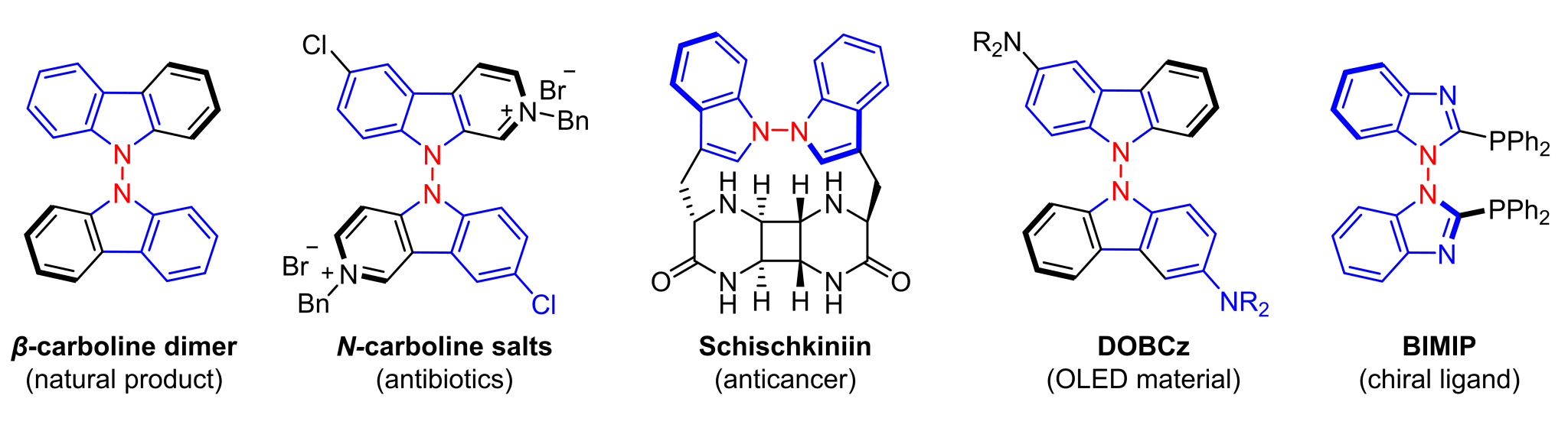 N-N轴手性吲哚在许多药物分子和功能砌块中广泛存在,如Dixiamycin A和B,N-咔啉盐是良好的抗生素;9,9-联咔唑衍生物可以作为OLED的原材料,在柔性电子显示领域有着巨大的应用潜能;BIMIP可以作为手性配体应用于不对称催化反应等。然而,由于N-N键去平面化时会导致旋转能垒相对较低以及构象不稳定等问题,N-N阻转异构体的对映选择性合成策略仍然有待发展(图1)。