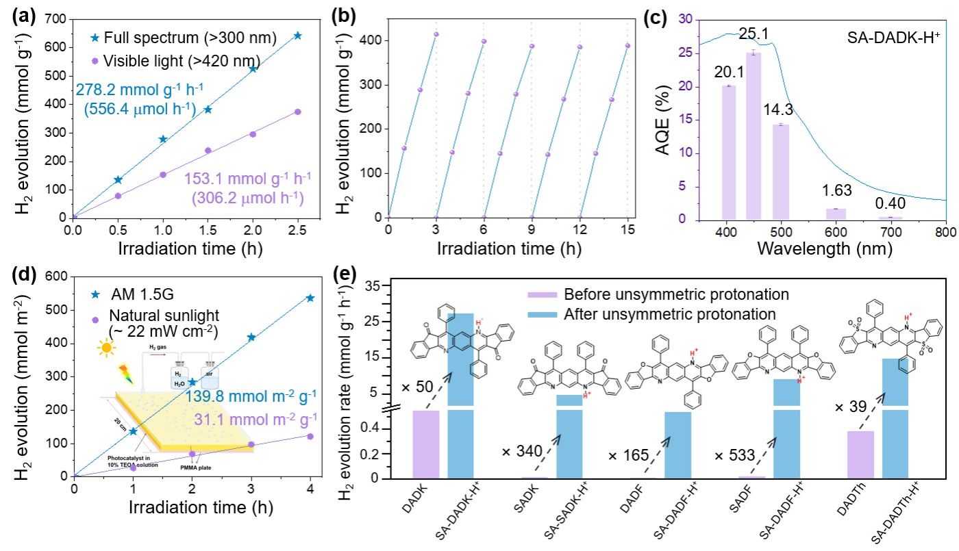 这些研究成果强调了对称性破缺在光生载流子行为具有非常重要的影响,并为实际的太阳能燃料生产开发了独特的极化和亲水自组装策略,突显了非对称质子化在定制光催化剂方面的巨大潜力。