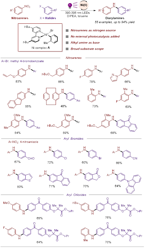 绿色催化与合成团队实现了光促进镍催化硝基芳烃与芳基卤化物的直接C-N偶联反应。该催化体系使用对空气稳定的Ni(II)-芳基络合物为催化剂,温和的三级胺DIPEA为碱,不需要外加光敏剂。该反应底物适用范围广泛,官能团耐受性好,对于邻位有空间位阻的硝基芳烃和卤代芳烃都表现出高的活性。