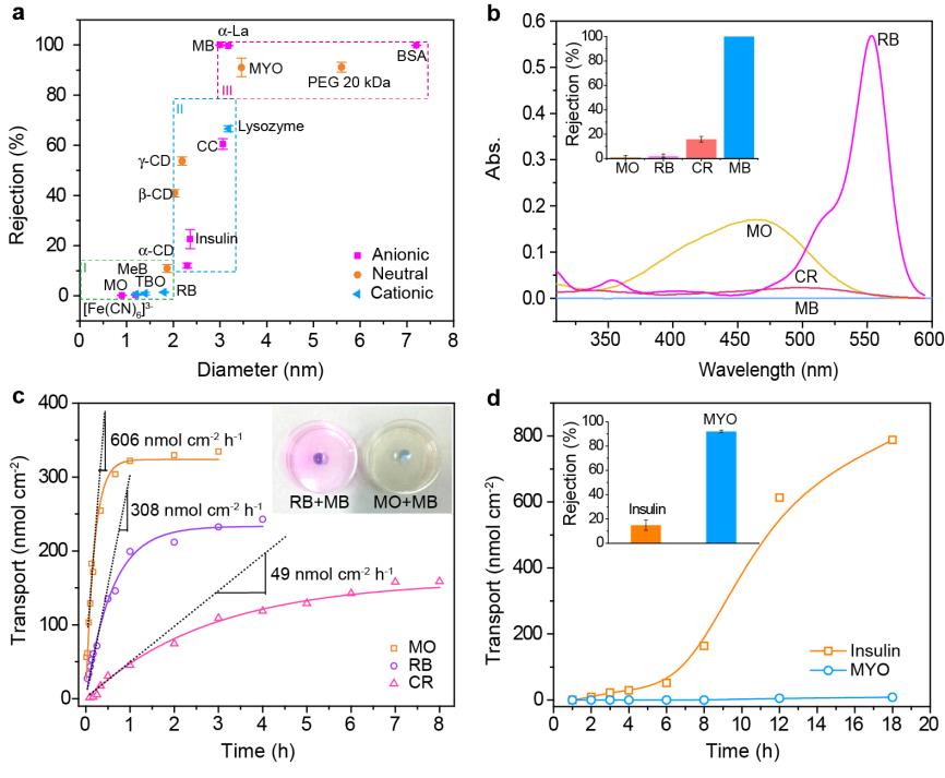 对于厚度为50纳米的膜(孔径3.2纳米),几乎可以完全截留3纳米以上的分子,而分子大小处于2-3纳米时,截留率在20-80%;小于2纳米的分子可以完全透过。在浓度差驱动下,该膜可以选择性的分离不同大小的混合染料(甲基蓝和甲基橙)以及混合蛋白质(胰岛素和肌红蛋白)。与常用分离膜相比,该纳米超薄膜对小于2纳米的分子的传质速率提升1~4个数量级(图3)。