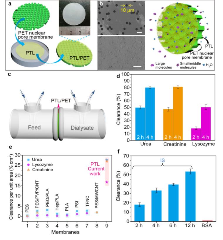 通过模拟血液透析,发现超薄的纳米膜厚度为快速、有效透析毒素提供了便利。如该膜对小分子、中等分子量尿毒素及其蛋白质结合毒素在透析4小时后都有较好的去除效果,单位面积的去除率是其他常用有机透析膜的5~6倍(图4)。