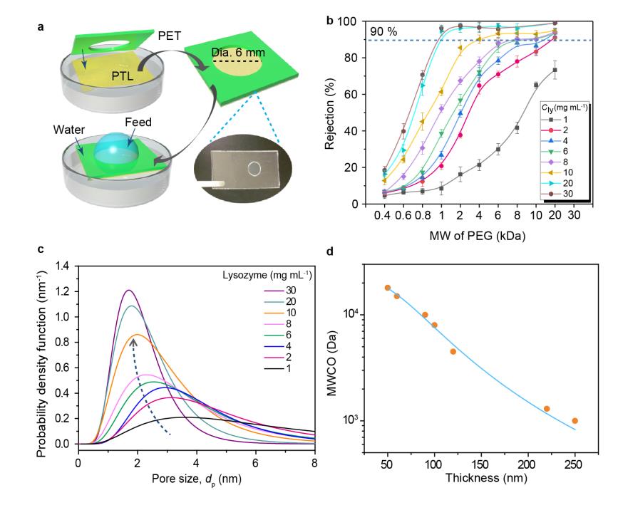 蛋白质基纳米膜可以通过简便的转移到商用聚对苯二甲酸乙二醇酯(PET)核孔膜(孔径10微米)上而使用。通过膜对不同分子量聚乙二醇(PEG)的截留率以及膜的BET测试,详细研究了不同厚度膜的孔径分布,随着膜厚度从50增加到250 纳米,膜的孔径从3.2减小到1.8纳米,相应的膜的截留分子量从18 kDa降低至1 kDa(图2)。