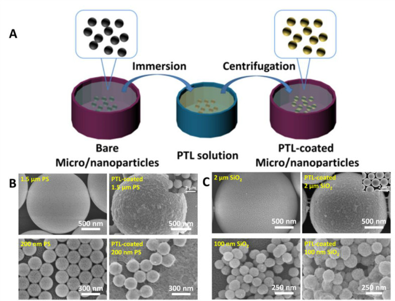 图2. 在聚合物(聚苯乙烯,PS)以及无机(二氧化硅,SiO2)微纳米颗粒表面涂覆PTL层的过程及电镜表征。