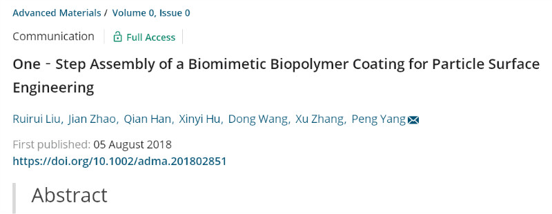 Ruirui Liu, Jian Zhao, Xinyi Hu, Dong Wang, Xu Zhang, Peng Yang*, One-Step Assembly of a Biomimetic Biopolymer Coating for Particle Surface Engineering. Adv. Mater., 2018, DOI: 10.1002/adma.201802851