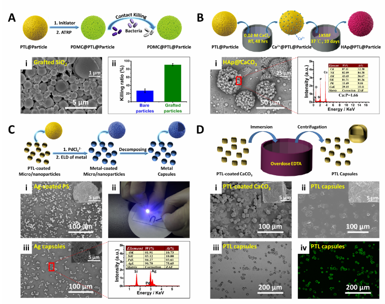 图3. PTL涂层支持的微/纳米颗粒表面功能化。(A) 通过原子转移自由基聚合(ATRP)在PTL涂覆的SiO2颗粒表面接枝具有抗菌功能的聚甲基丙烯酰氧乙基三甲基氯化铵 (PDMC)聚合物刷;(B) 通过界面仿生矿化在PTL涂覆的CaCO3粒子表面生长羟基磷灰石 (HAp);(C) 通过钯催化的无电沉积在PTL涂覆的PS颗粒上沉积高导电性金属层以及通过去除PS模板制备空心金属胶囊;(D) 通过ethylenediaminetetraacetic acid disodium salt (EDTA)蚀刻去除CaCO3模板的方法制备空心蛋白质胶囊(即壳层为纯的PTL膜)。