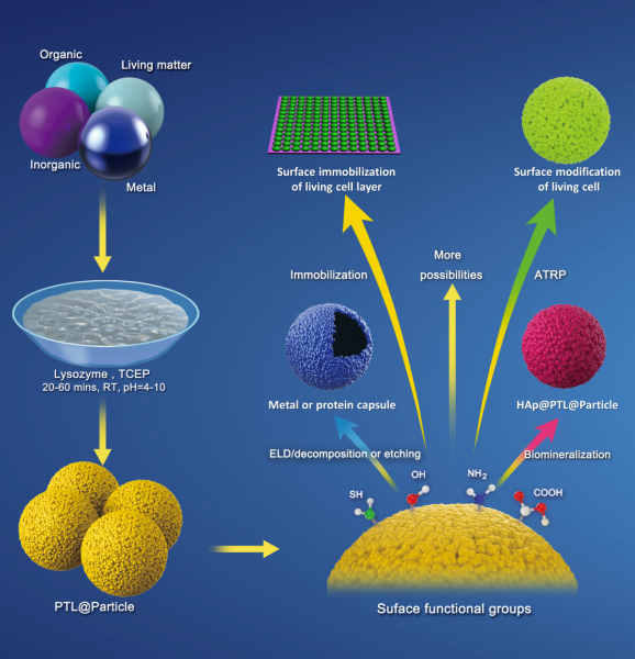 微/纳米颗粒在催化、传感器、涂料、复合材料、光电、能源、环境和生物医学等领域均有广泛和重要的应用价值。颗粒的表面化学和物理结构决定了胶体粒子的稳定性、生物活性和相容性等关键参数。因此,颗粒表面工程已成为材料设计和应用的一个重要领域。目前能在温和水溶液中一步、低成本实现对具有不同成分、大小、形状和结构的微纳米颗粒的表面功能化的普适性方法很少。