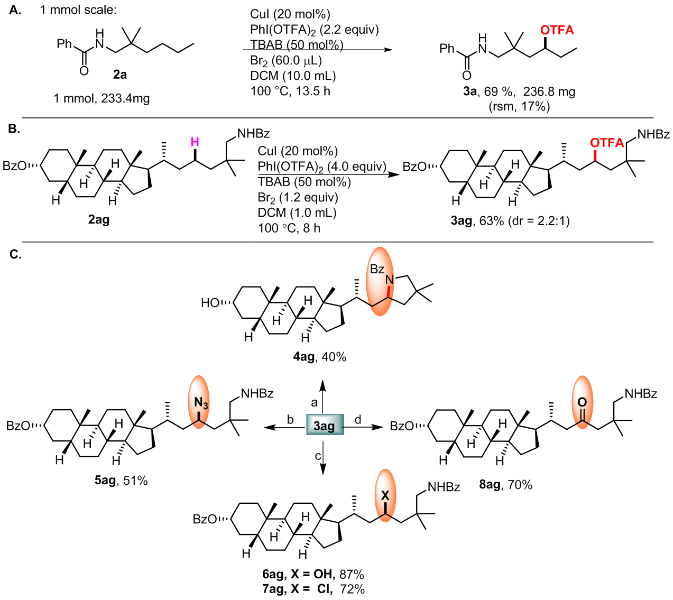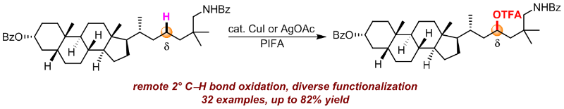 现代药物合成与发展中,快速构建和衍生某些重要有机中间体化合物的策略是非常重要的。发展该类方法可以快速、有效的测试一系列从“母体”分子衍生出来的类似物来寻找药物分子中的先导化合物。在过去十年间,惰性碳氢键的直接官能团化已经成为一种直接的构建复杂有机化合物的重要方法之一。该类方法可以高效、高选择性直接实现碳氢键到各种官能团的直接转化。但是,传统的碳氢键活化转化得到的产物单一,不能进行进一步的衍生,一定程度上限制了其在药物分子先导化合物的高通量筛选。基于此,可否通过引入某个官能团,然后通过该官能团能迅速转化为其他官能团,即所谓的从“母体”分子衍生出一系列类似物。这样可迅速建立化合物库,为后期的高通量筛查提供一定的实验基础。