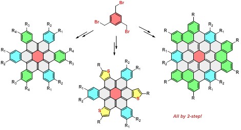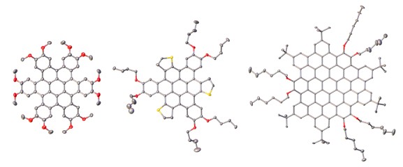 利用此方法,该研究团队成功合成了三个系列共30种C3-对称的多取代新型纳米石墨烯分子,并获得了各系列中代表性化合物的单晶X-射线结构,其中25环纳米石墨烯是目前经X-射线结构分析确定的、最大的全苯型纳米石墨烯。