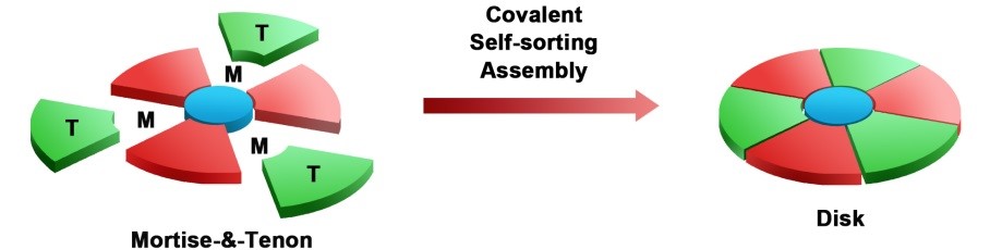该课题组提出一种新颖的合成概念——共价自组装(Covalent Self-sorting Assembly,CSA),作为蒄类(Coronene-based)纳米石墨烯分子合成路线的核心合成策略。这种CSA合成策略十分简单,其本质可以形象地用榫卯契合(Mortise-&-Tenon)表示。